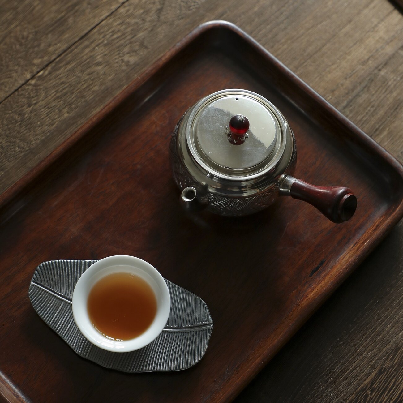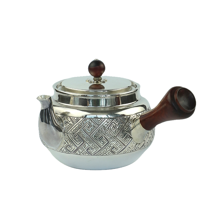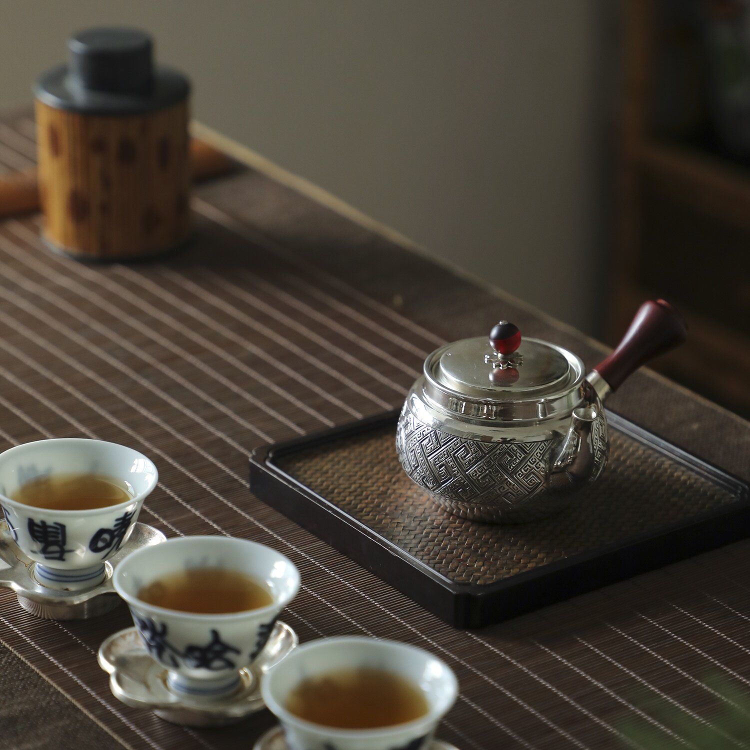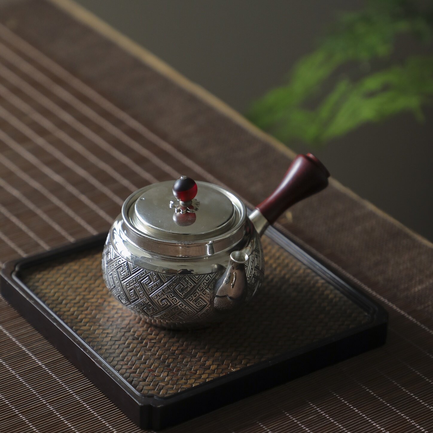 纯银时代 錾刻回纹侧把急须泡茶壶足银999纯手工日式手工壶200ml