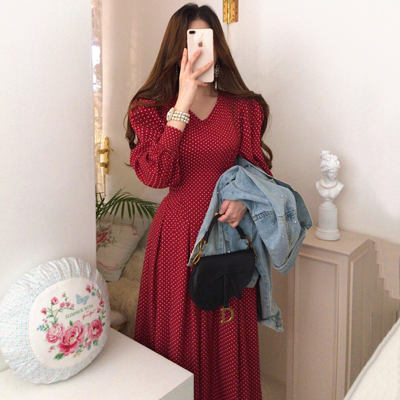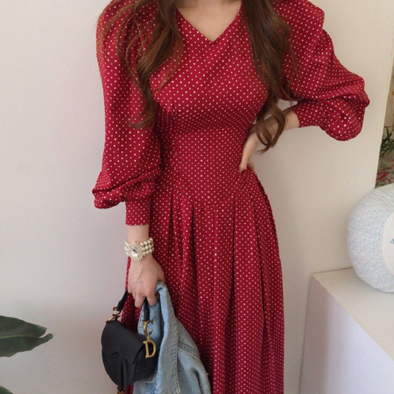 韩国chic复古优雅显瘦V领修身高腰系带压褶灯笼袖小波点连衣裙女