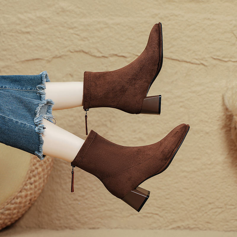 短靴女2025秋冬新款高跟靴中筒卡其色绒面单靴粗跟时装弹力瘦瘦靴