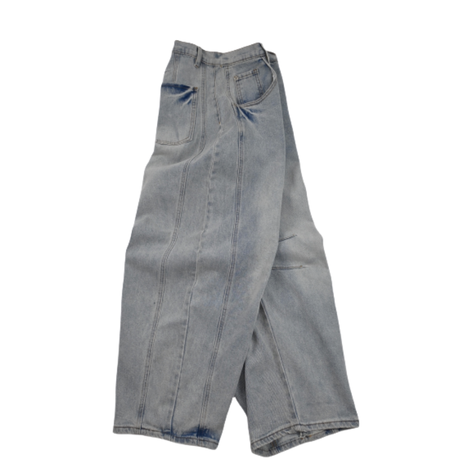 扎染水洗做旧美式复古宽松阔腿弯刀牛仔裤纽扣情侣款百搭高街长裤