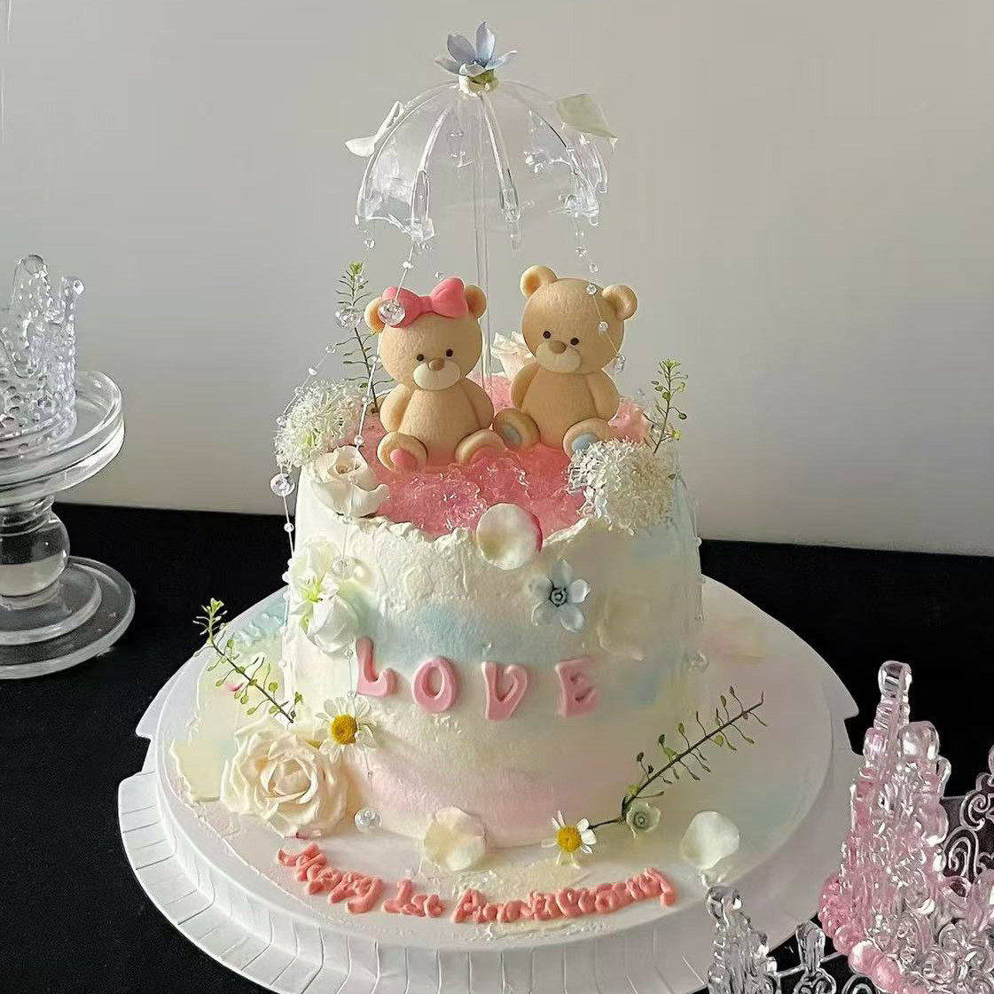 情人节坐姿小熊蛋糕装饰摆件2.14透明小雨伞情侣表白节日烘焙装扮