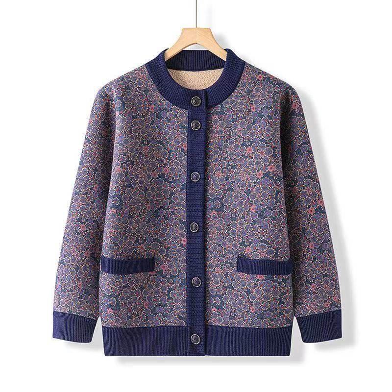 中老年人气质开衫印花春冬款加绒加厚保暖休闲短外套女妈妈上衣秋