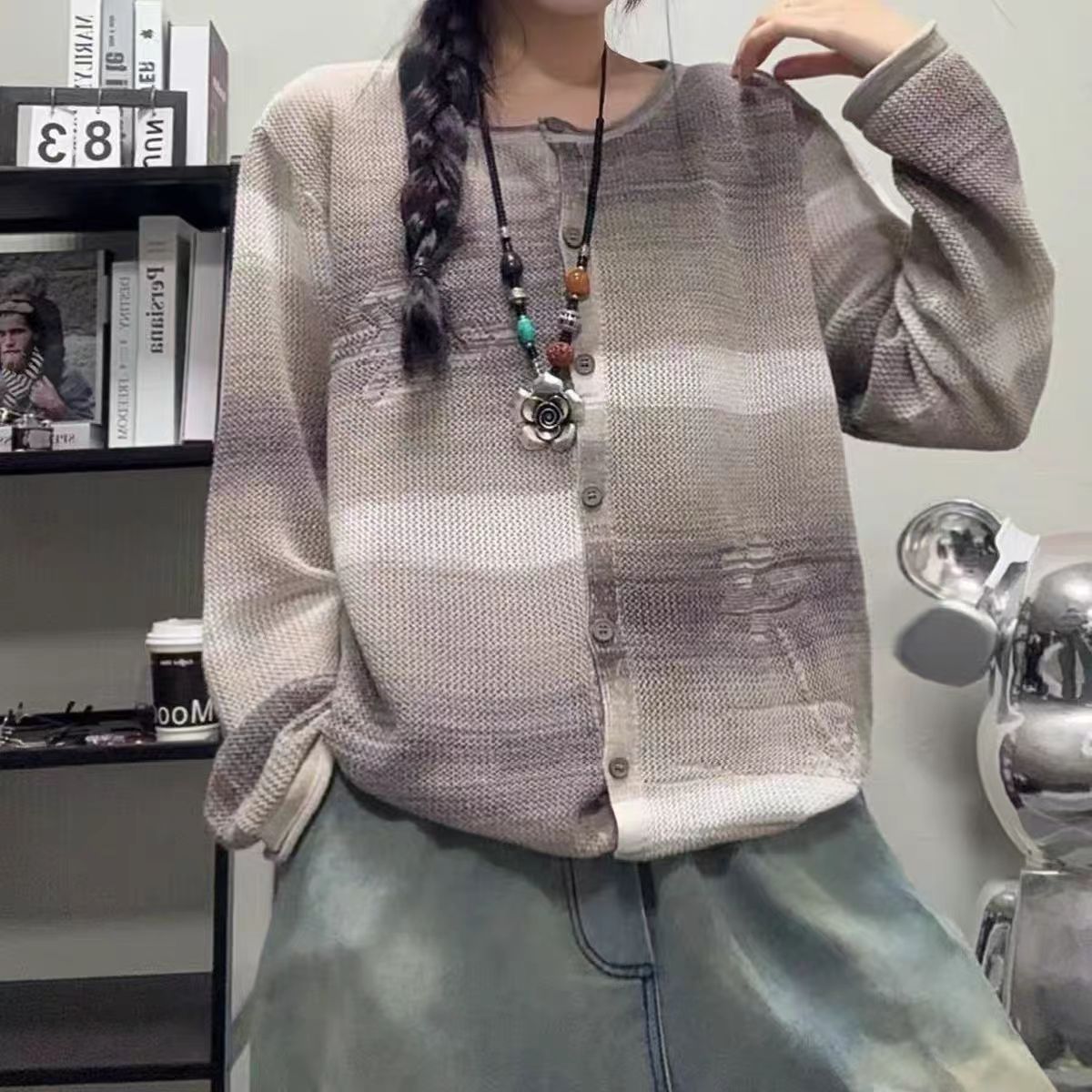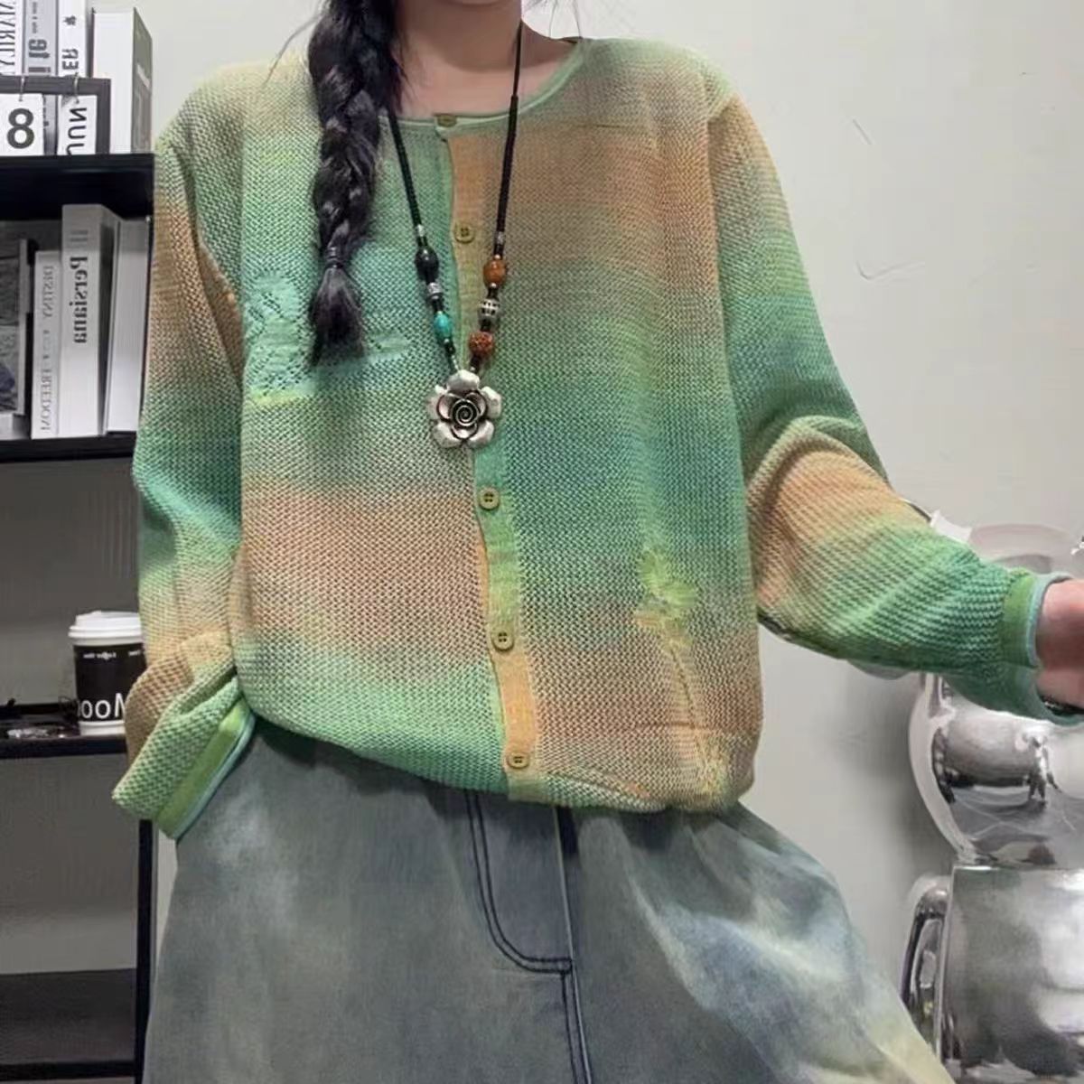 23214复古洋气渐变色晕染长袖毛衣外套宽松百搭纯棉线针织开衫女