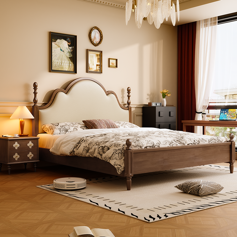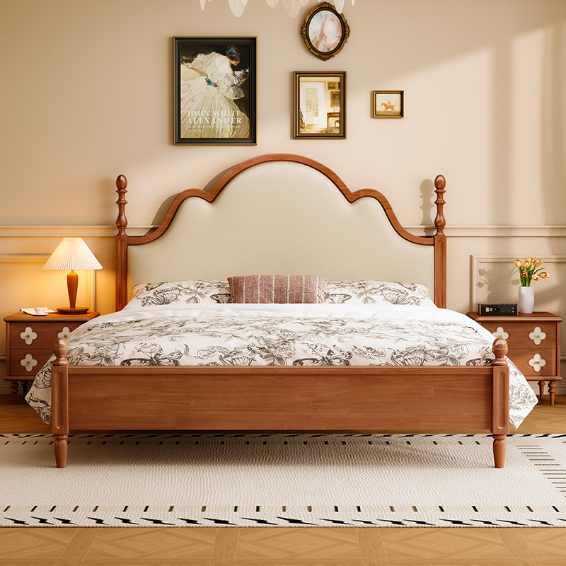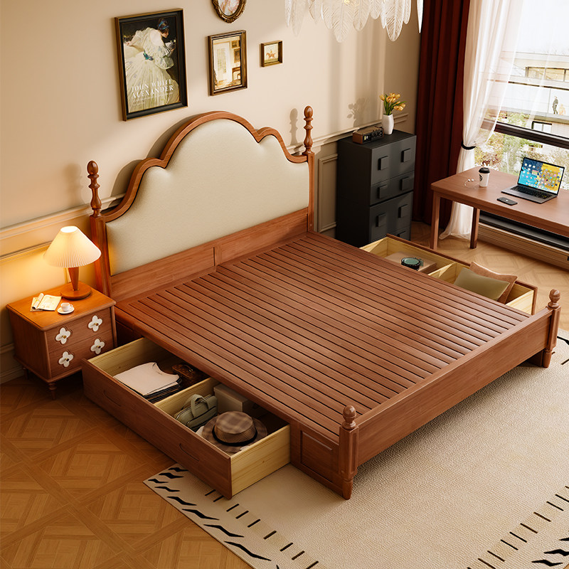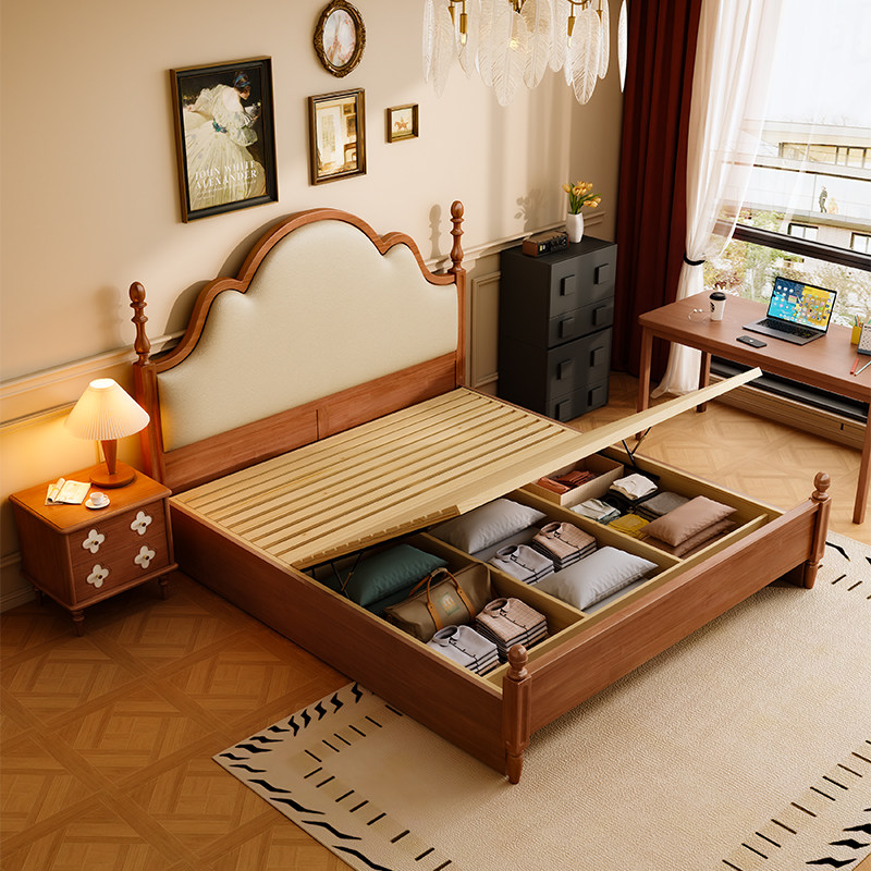 中古风奶油实木床法式复古1.8m双人床架高箱储物床美式软包安娜床