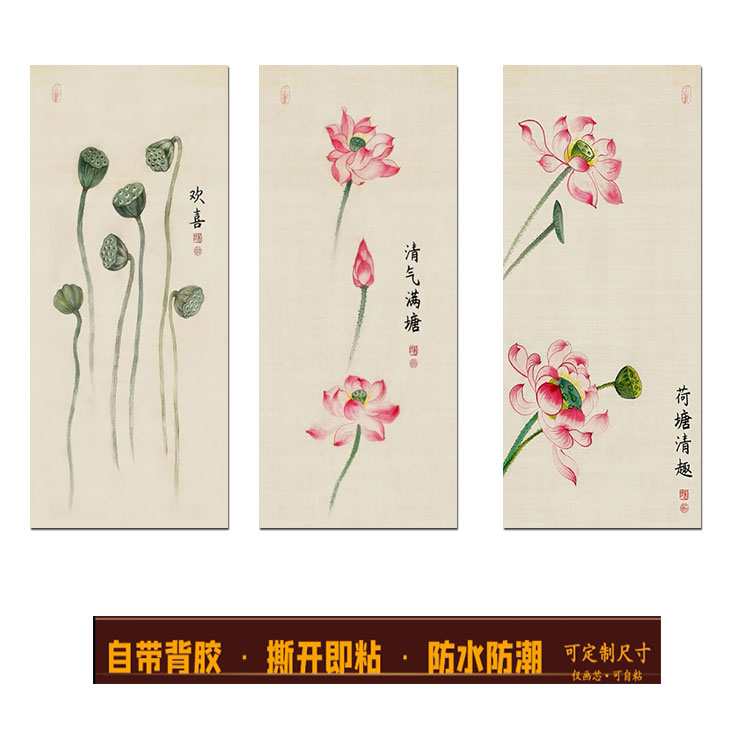 荷花进门入户玄关装饰贴画新中式禅意走廊过道竖版茶室风水自粘画
