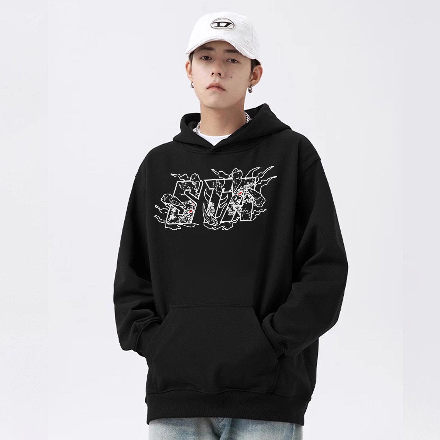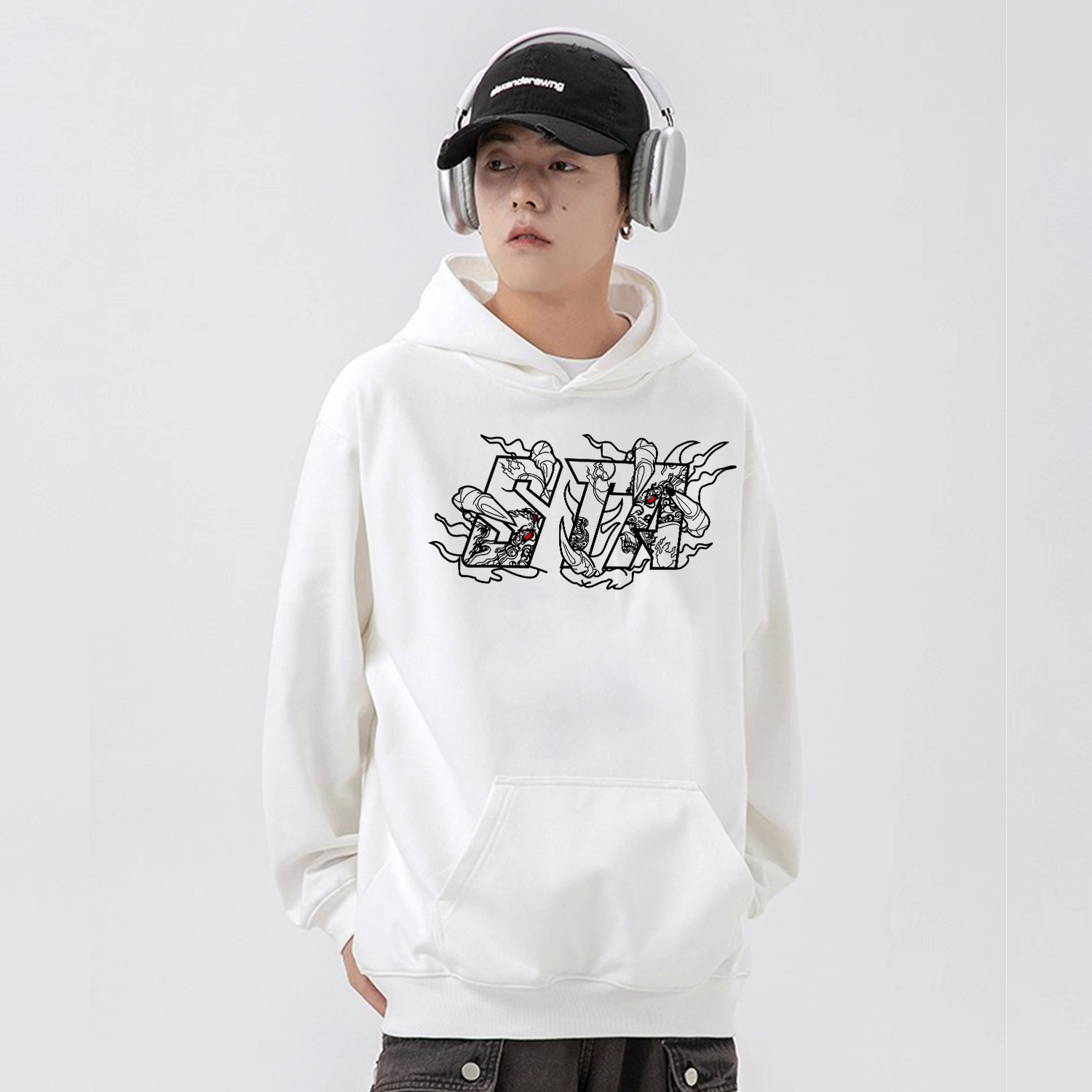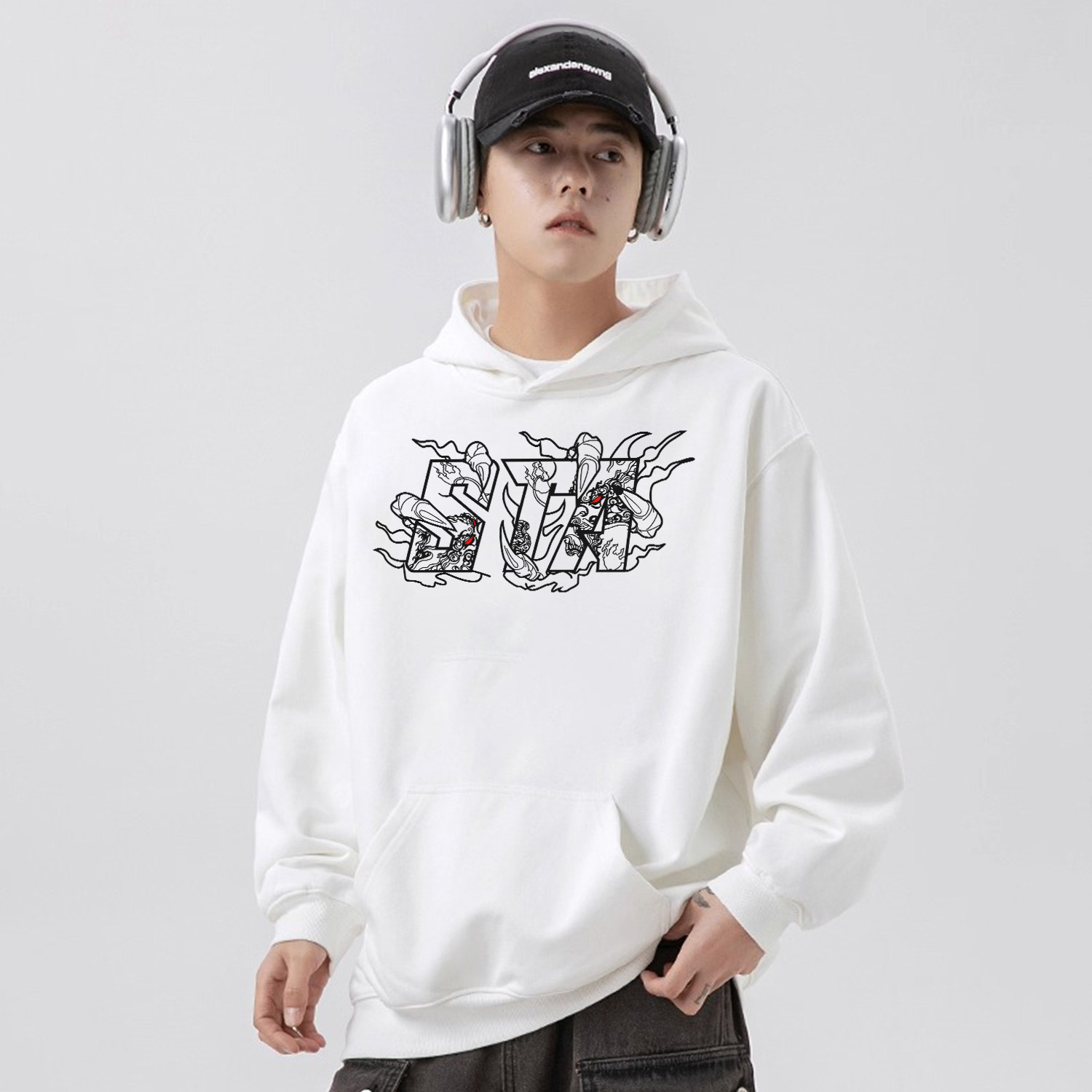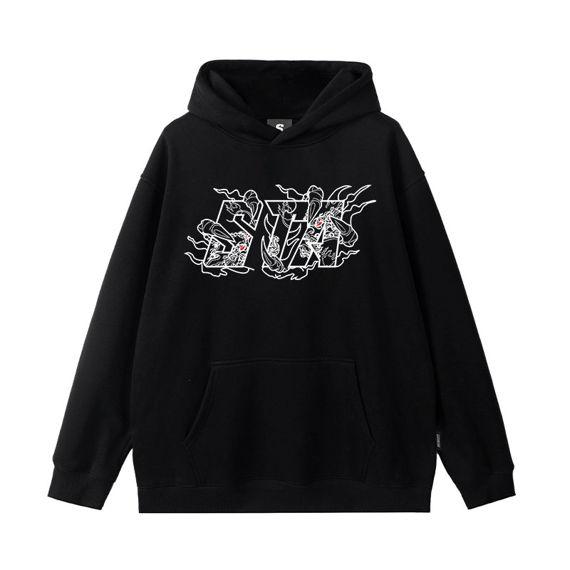 STA复古字母龙爪印花连帽卫衣男女秋冬宽松加绒加厚街头套头上衣