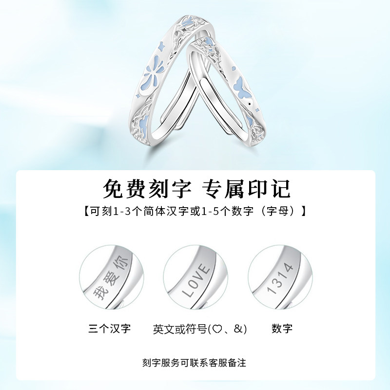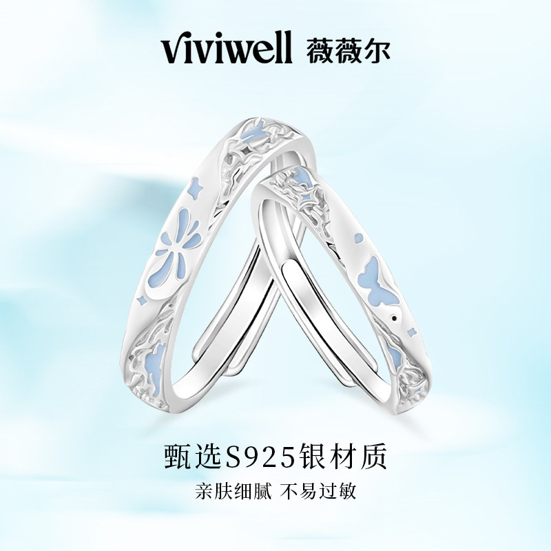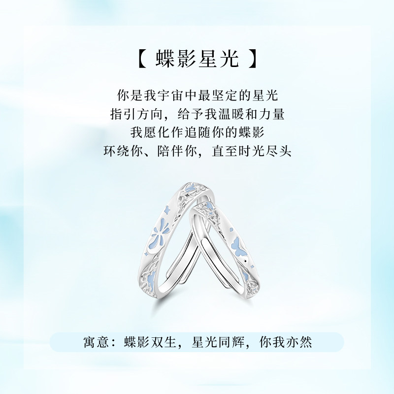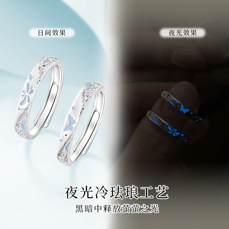 VIVIWELL蝶影星光 夜光蝴蝶情侣对戒轻奢S925纯银素圈戒指送女友