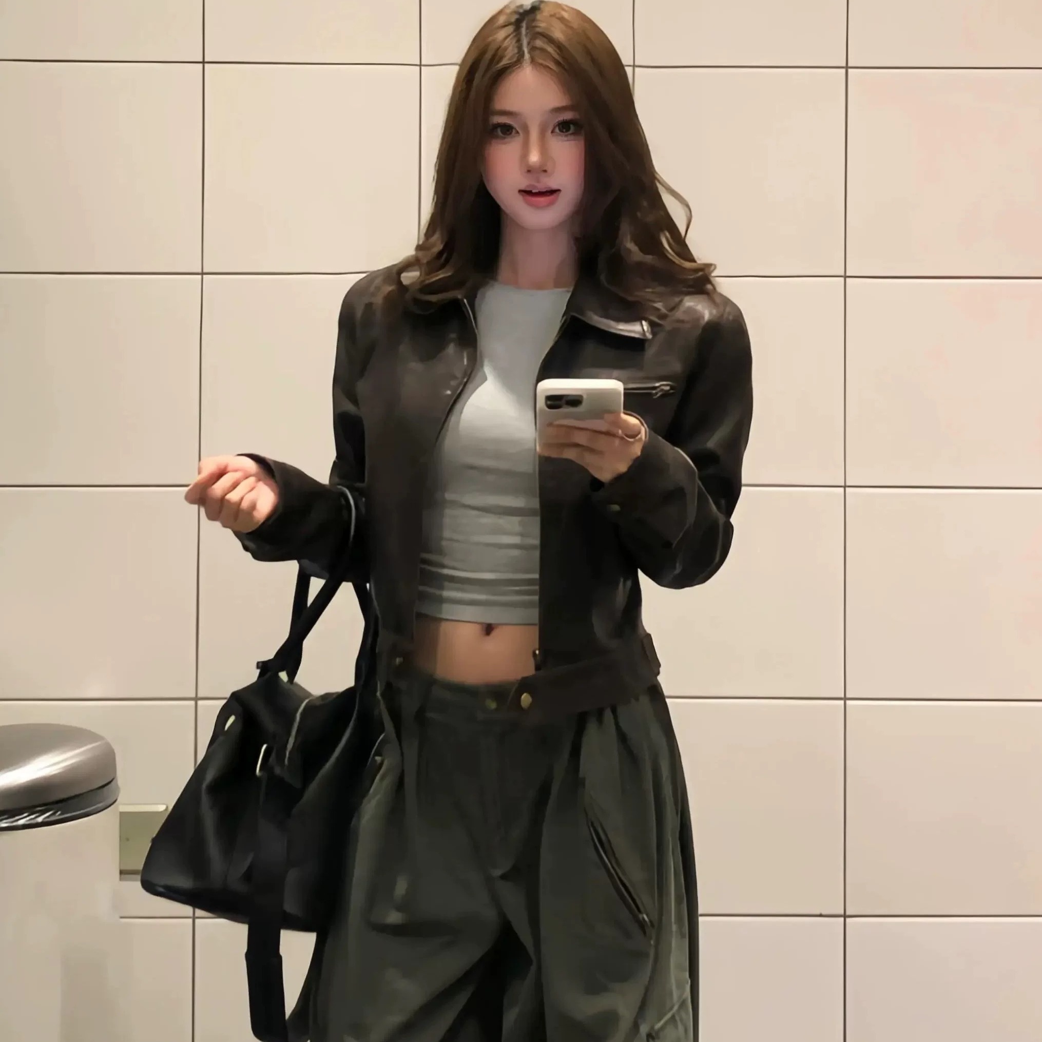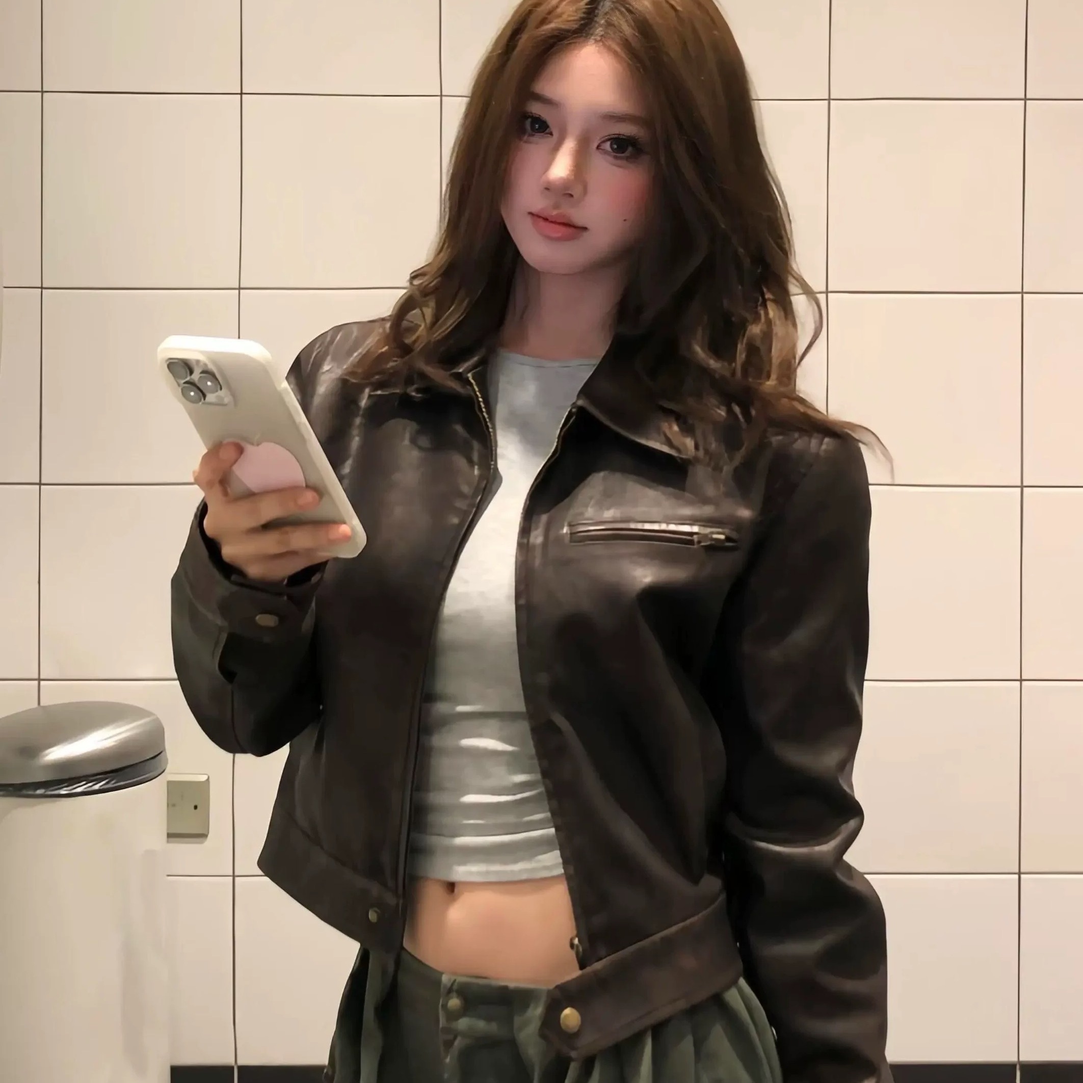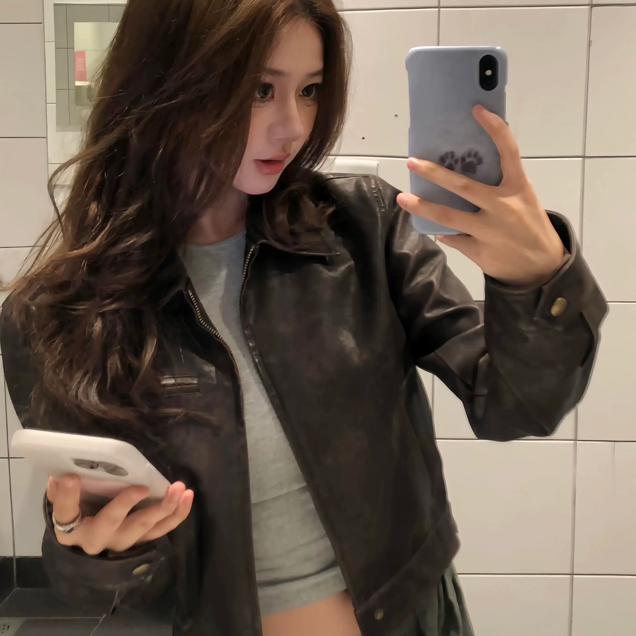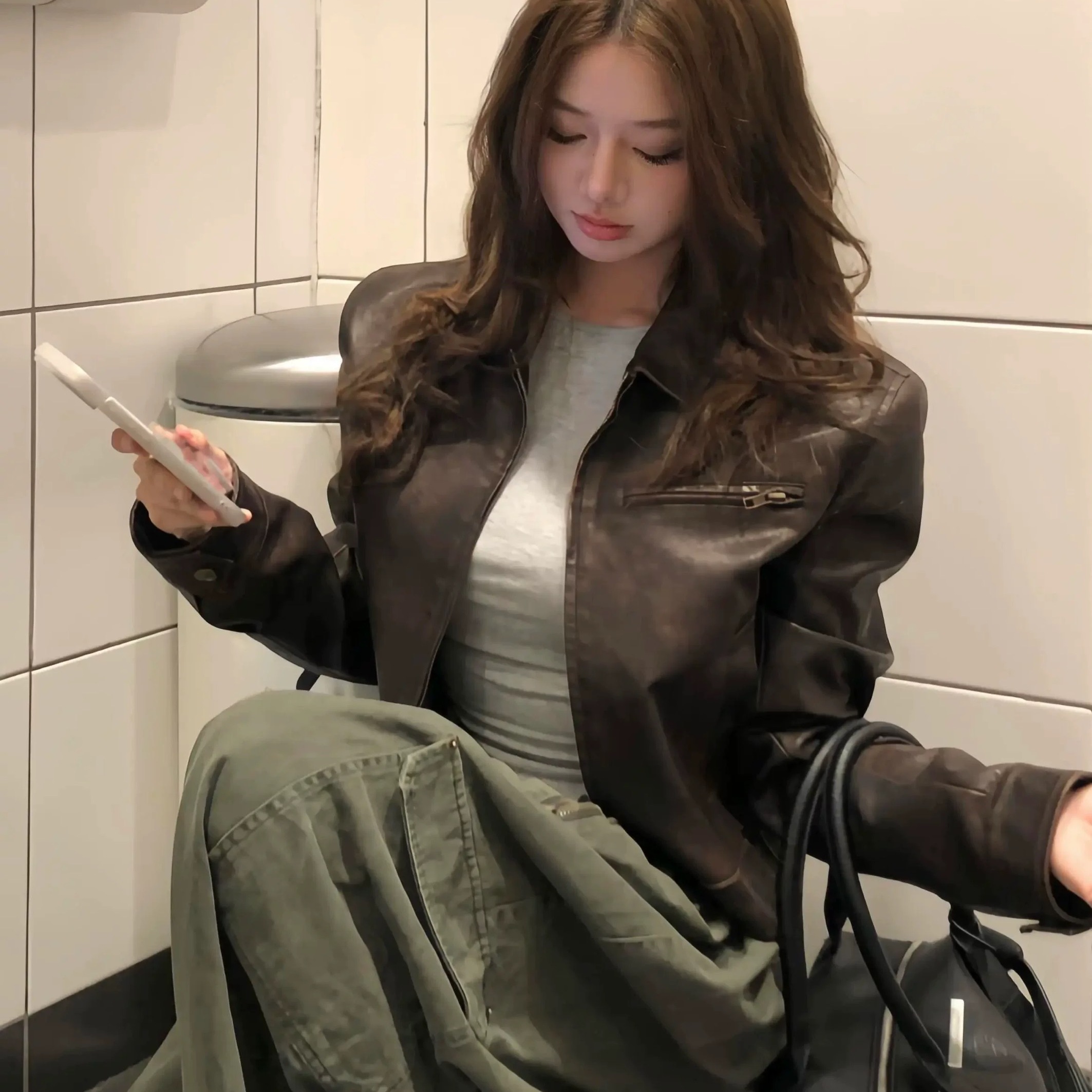 美式复古咖色翻领短款皮衣外套女秋季修身PU皮酷飒风机车夹克上衣