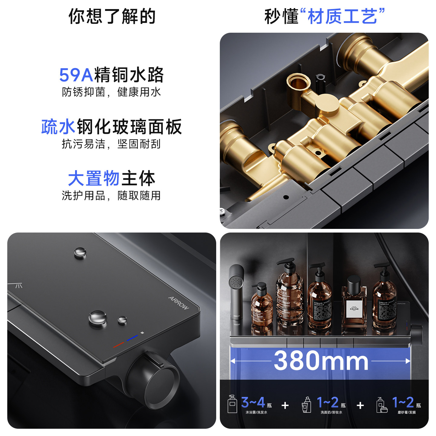 箭牌卫浴枪灰恒温淋浴花洒套装家用浴室钢琴键增压全铜淋浴器喷头