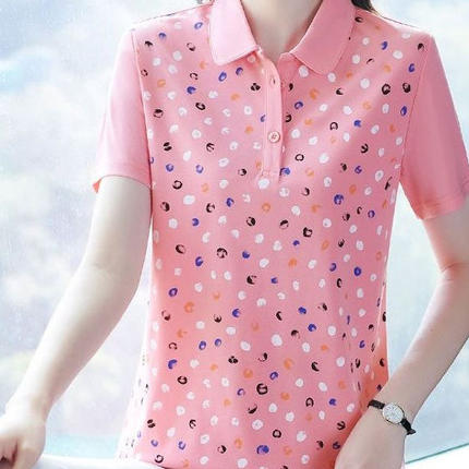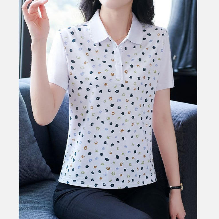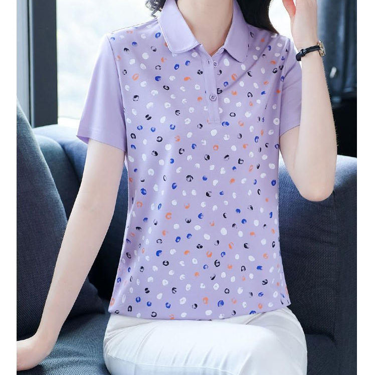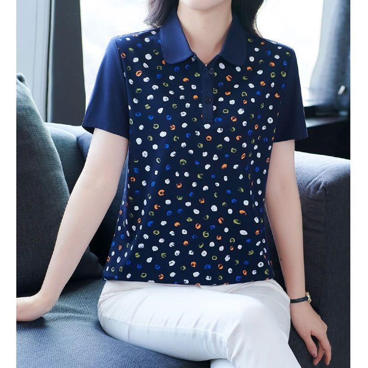 洋气短袖t恤女夏装中年妈妈polo衫宽松显瘦上衣翻领大码印花小衫