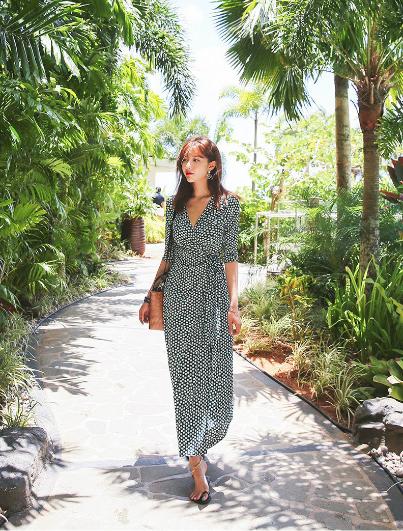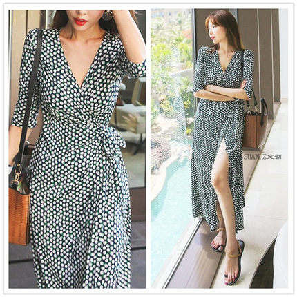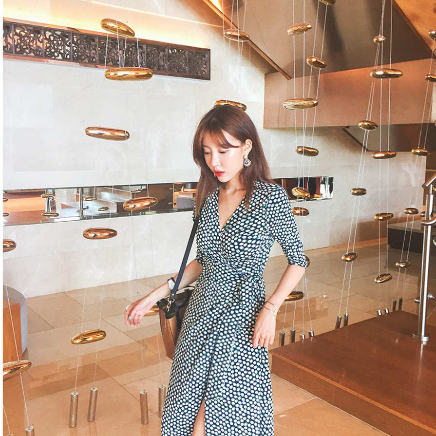 2025年夏季新款韩版女装时尚波点印花连衣裙女系带收腰裹身裙长裙