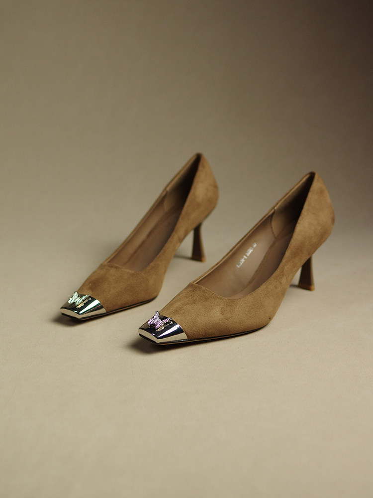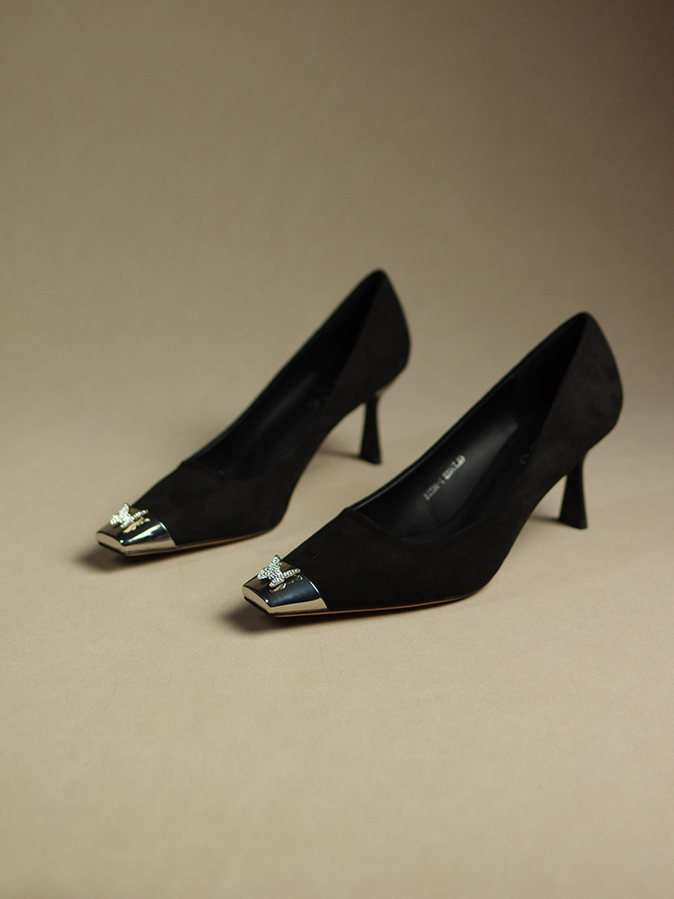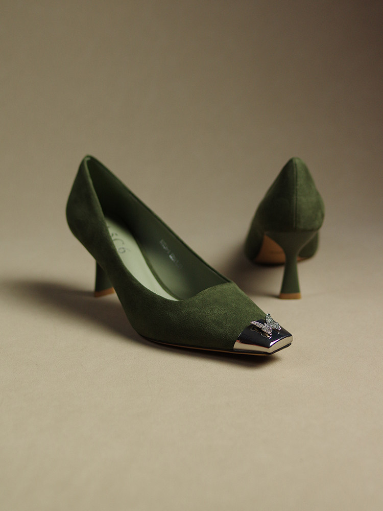 绿色绒面高跟鞋女2023新款金属方头扁跟时尚气质名媛浅口单鞋7cm