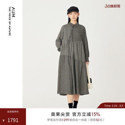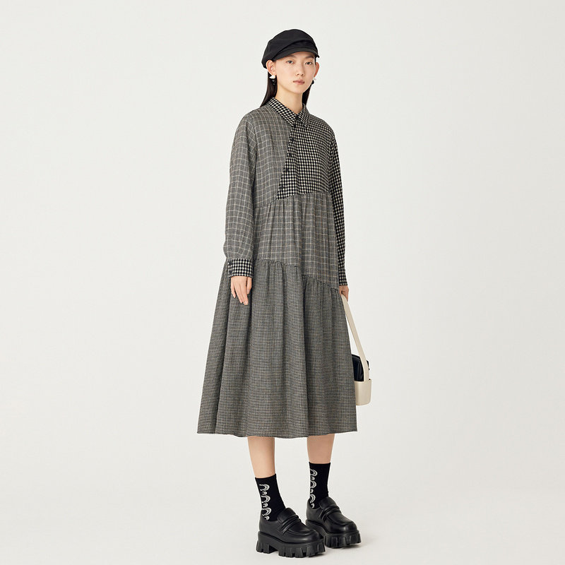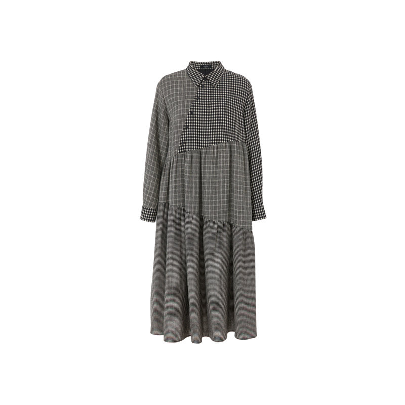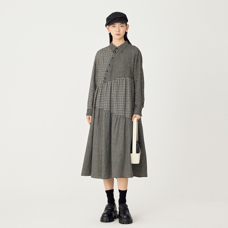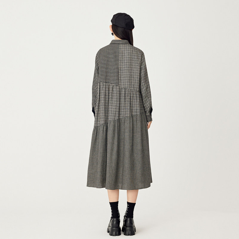 AUM噢姆冬季黑白格纹拼接衬衫式宽松连衣裙娃娃裙女