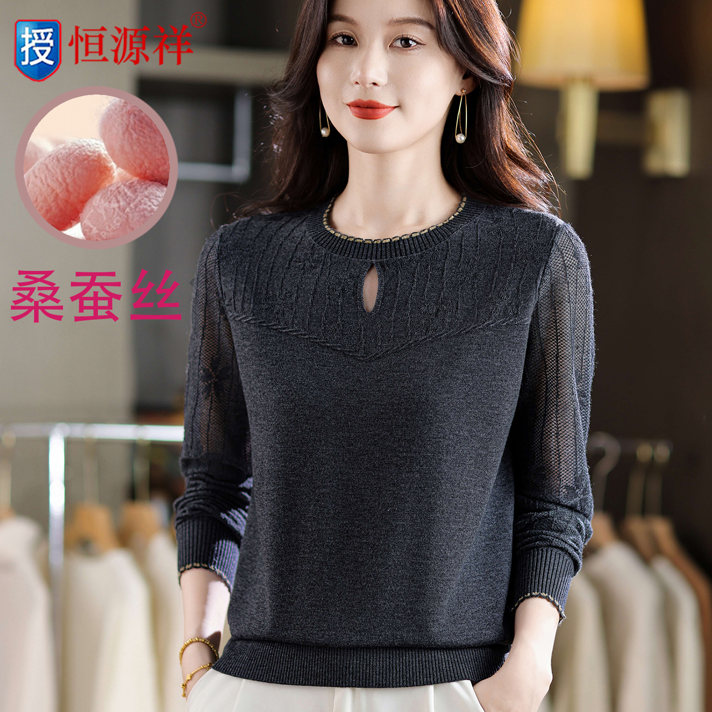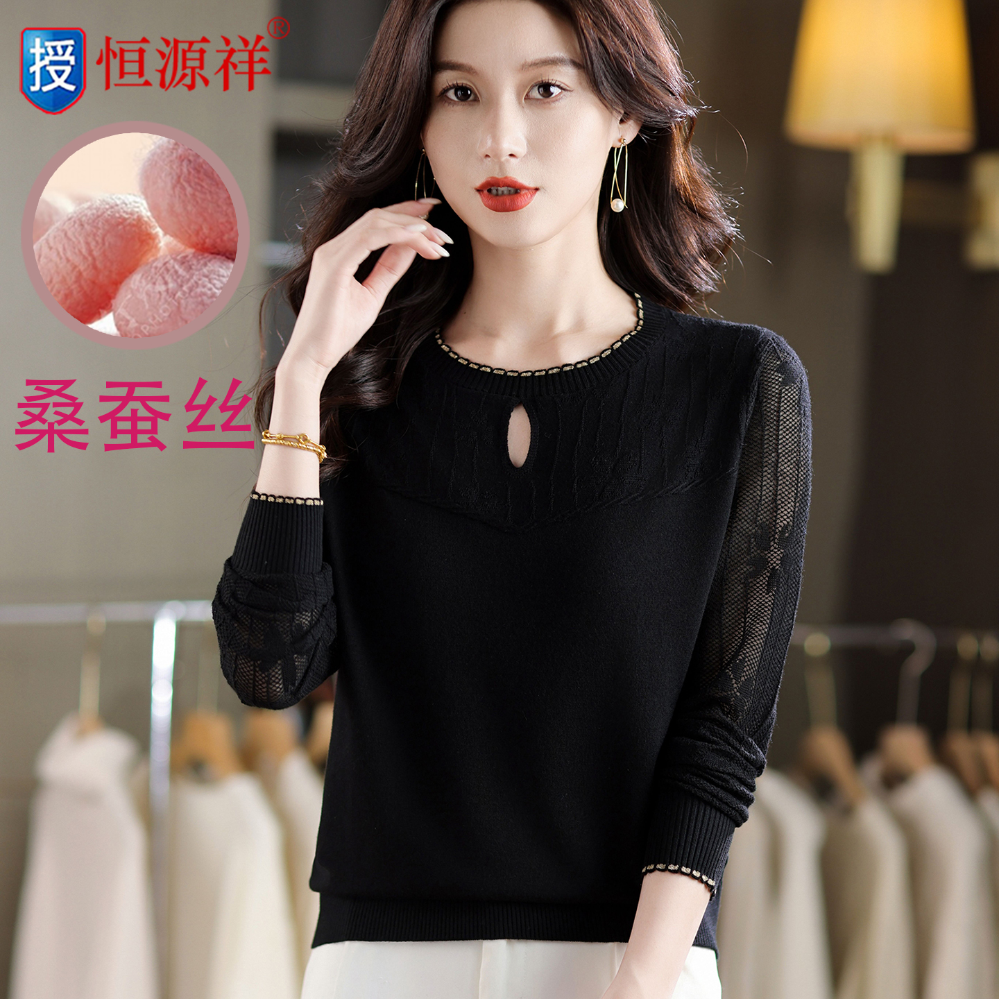 恒源祥妈妈装T恤上衣2025新款春秋季桑蚕丝镂空针织衫薄款打底衫