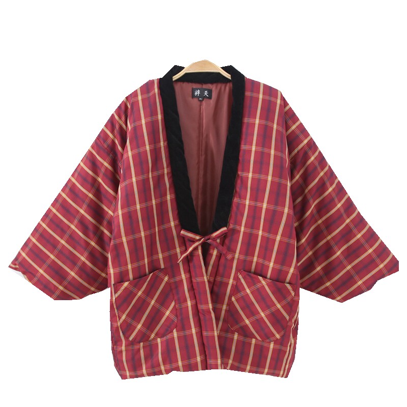 日本格子男女和风棉袄学生羽织秋冬加厚夹棉款半缠系带家居服外套