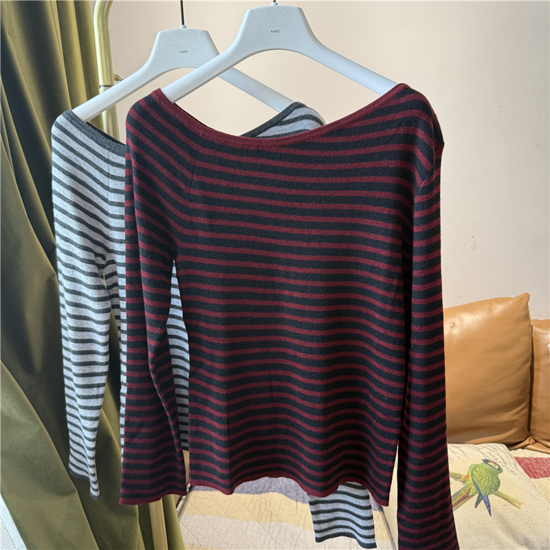 2025羊毛一字领斜边露肩条纹针织衫女修身显瘦百搭打底毛衣上衣