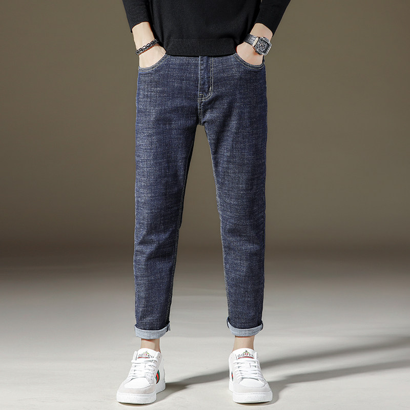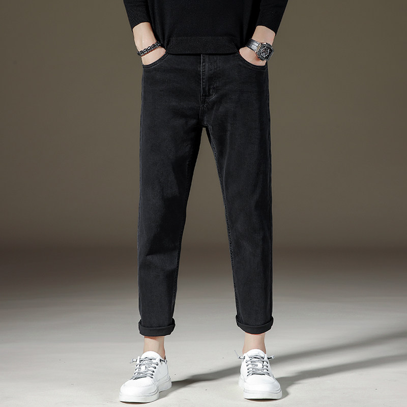 弹力黑色九分牛仔裤男士秋冬加绒宽松直筒潮流春秋潮牌9分裤子男