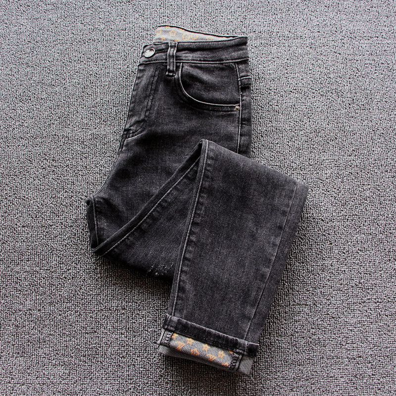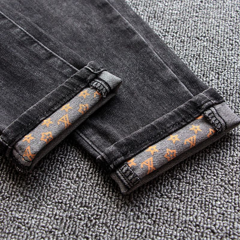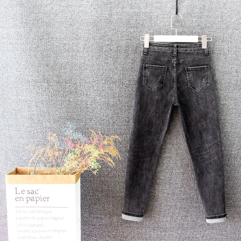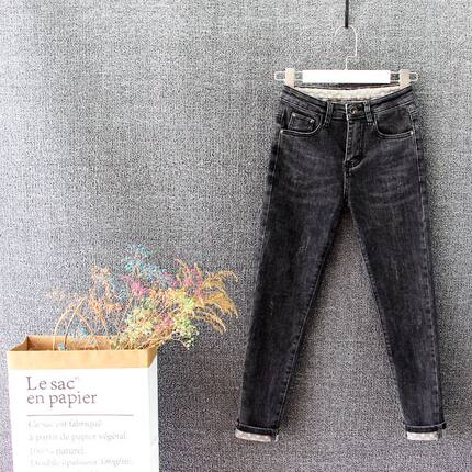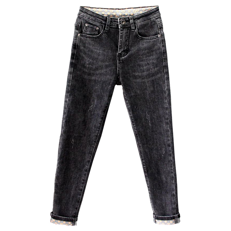 黑灰色牛仔裤女紧身小脚裤弹力铅笔裤翻边印花韩版中腰新款长裤潮