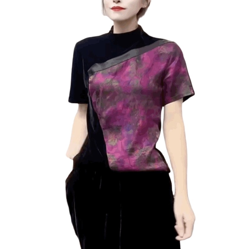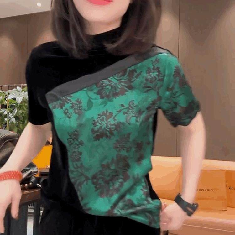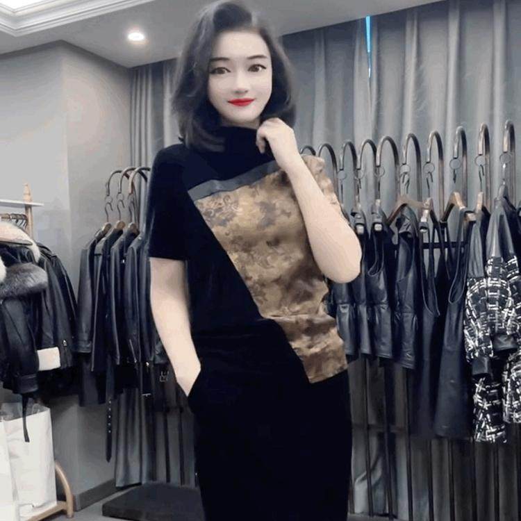 法式小香风金丝绒短袖T恤女欧货丝绒拼接雪纺打底衫高领黑色上衣