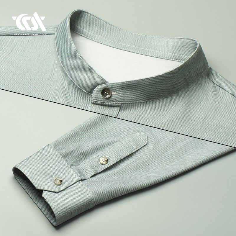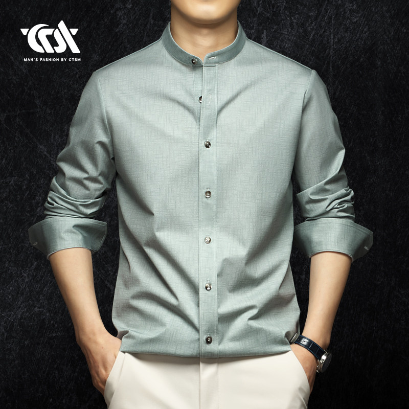 春秋季男士高端立领长袖衬衫丝光棉纯棉修身衬衣2024男装新款春装