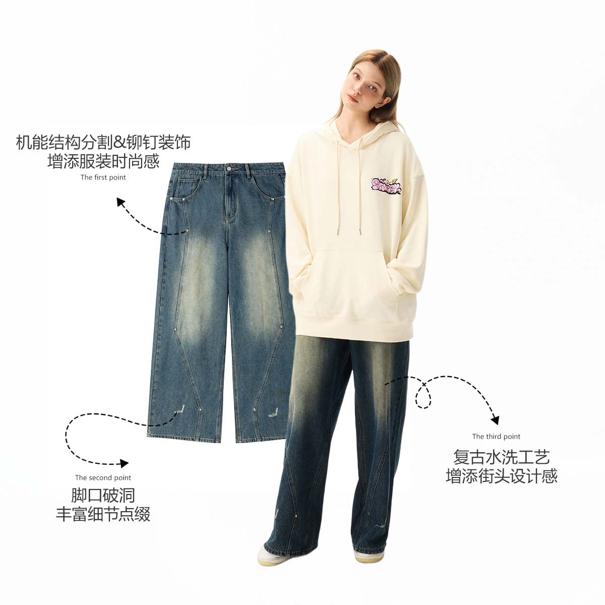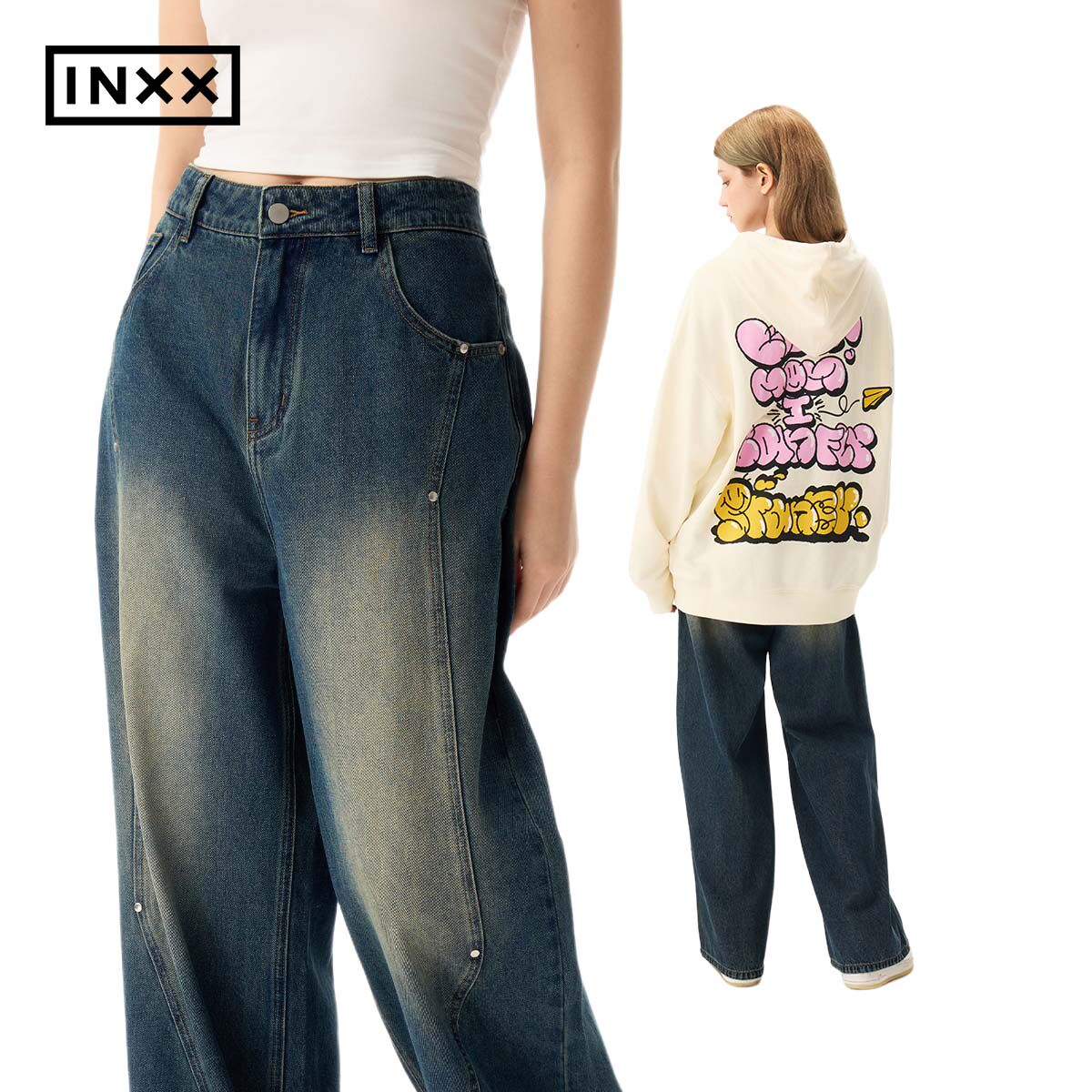 明星同款 INXX复古水洗牛仔裤男机能感铆钉设计宽松直筒裤长裤
