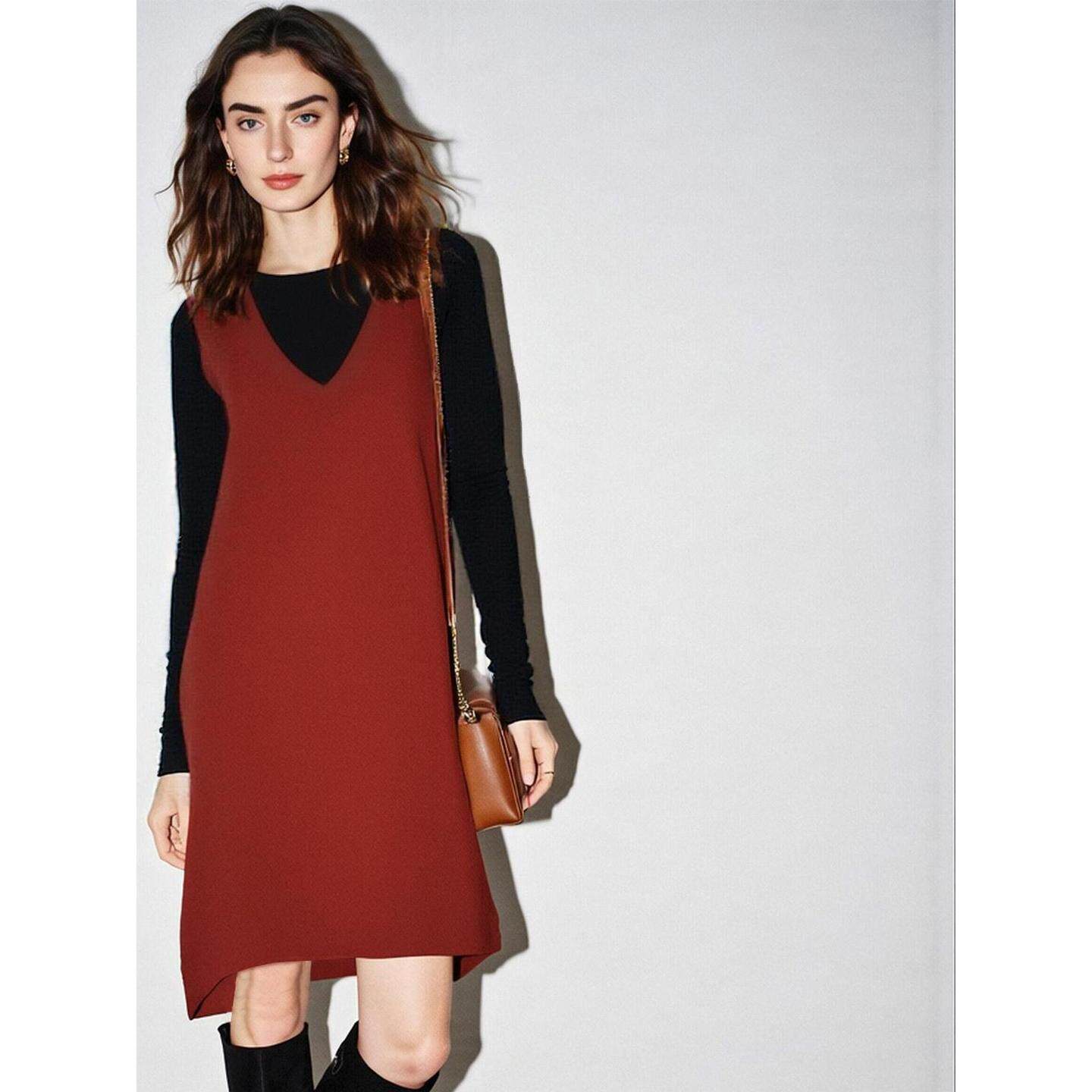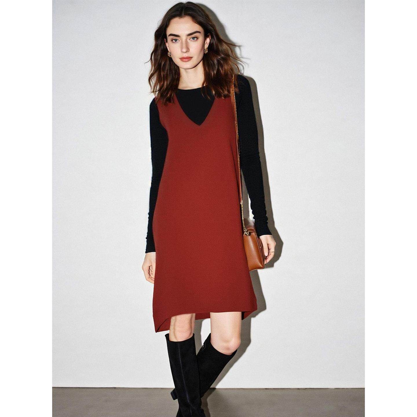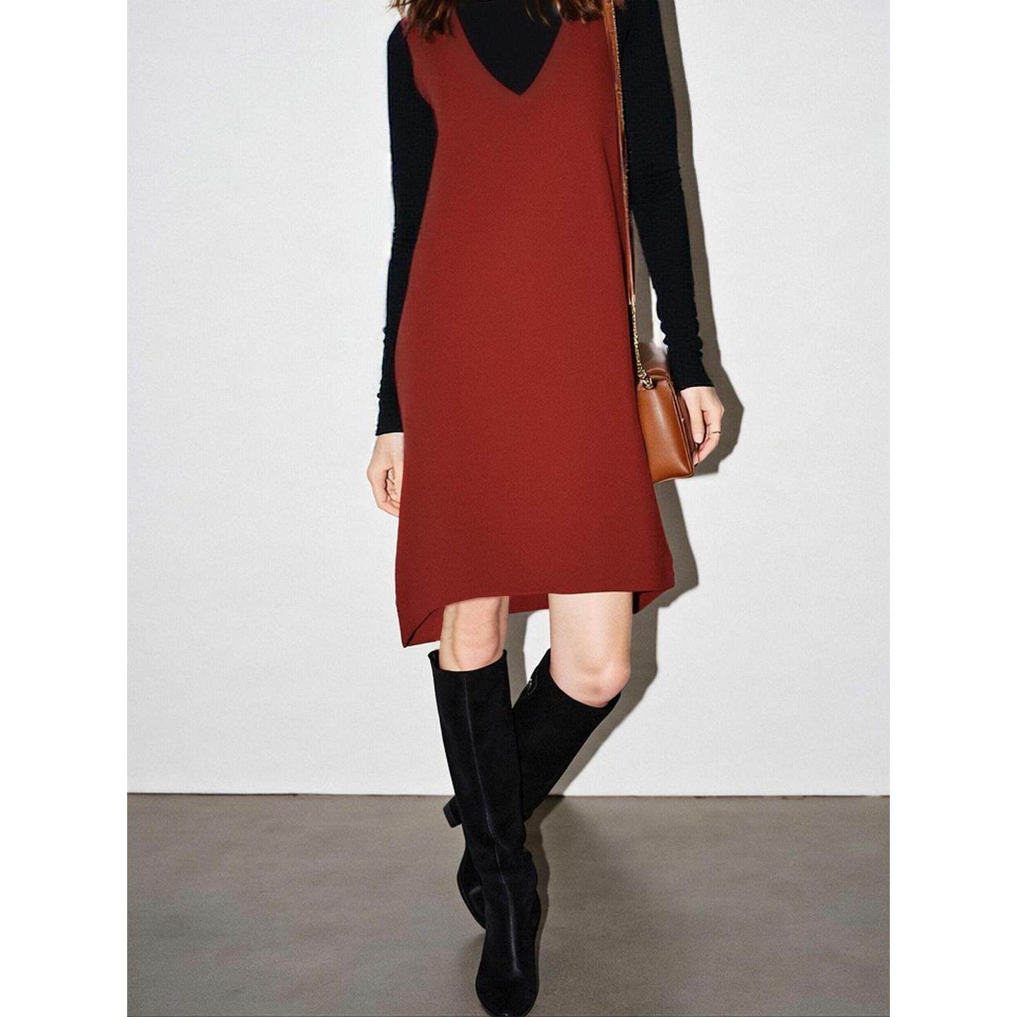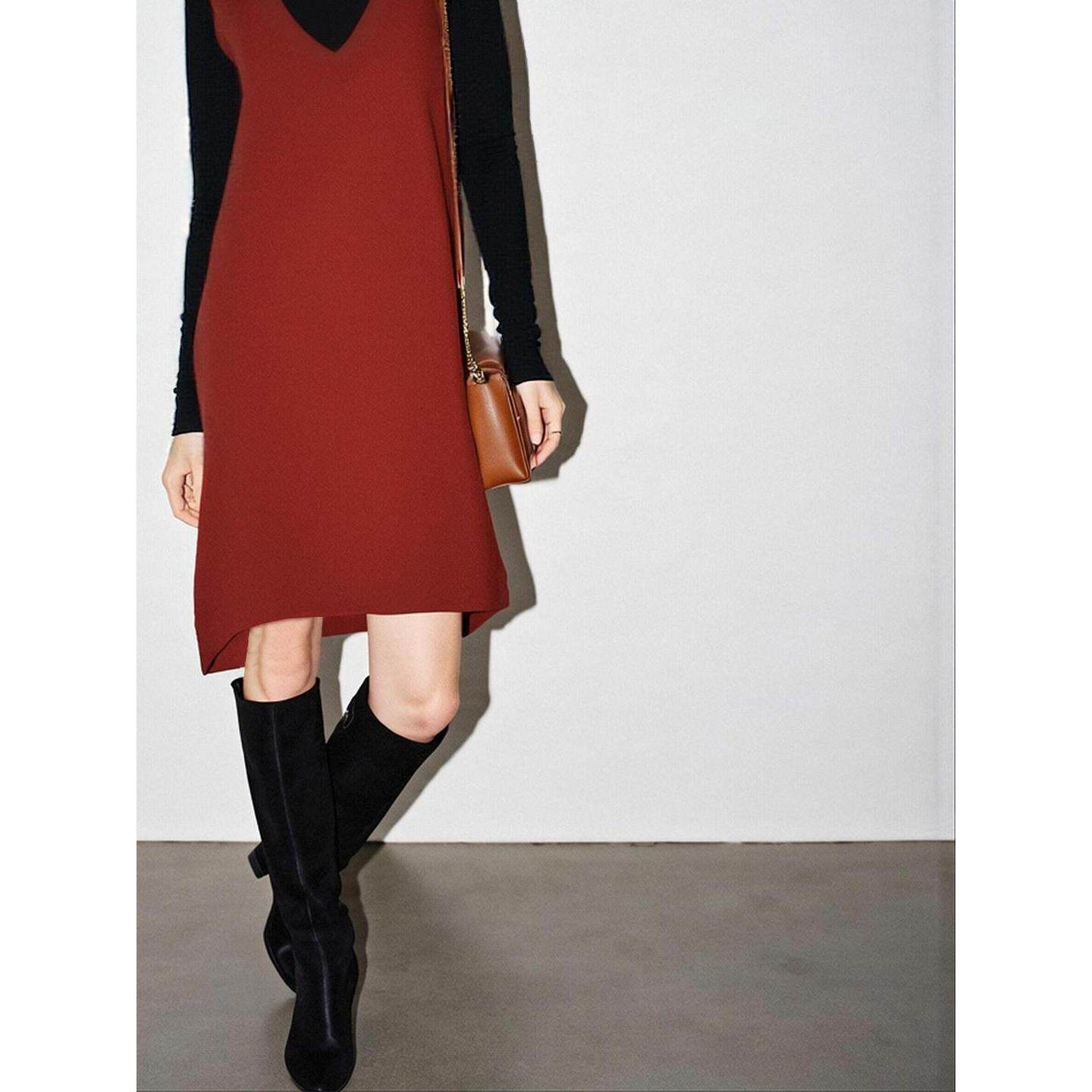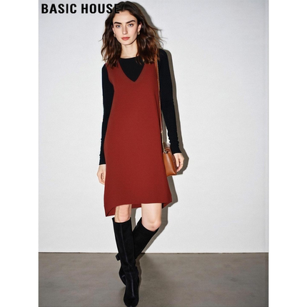 Basic House/百家好新年红V领连衣裙女2026春季新款含羊毛背心裙