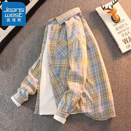 真维斯格子长袖衬衫男春秋季潮牌透气青少年宽松休闲衬衣翻领外套