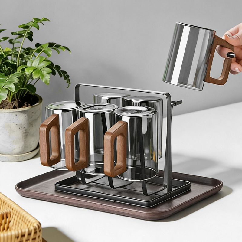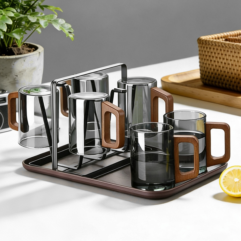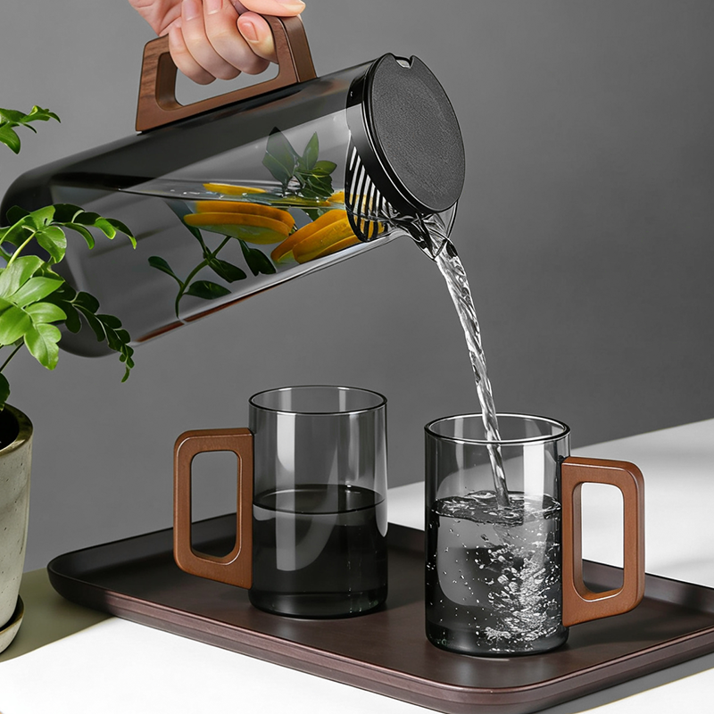 家用水杯玻璃杯水具套装木把水杯客厅茶杯杯子耐高温水壶水杯套装