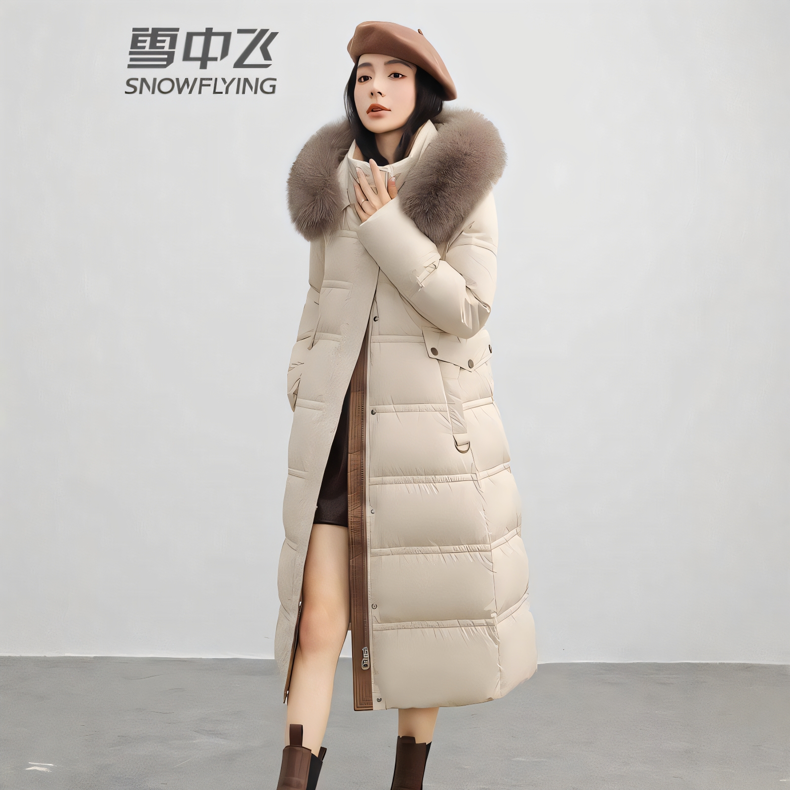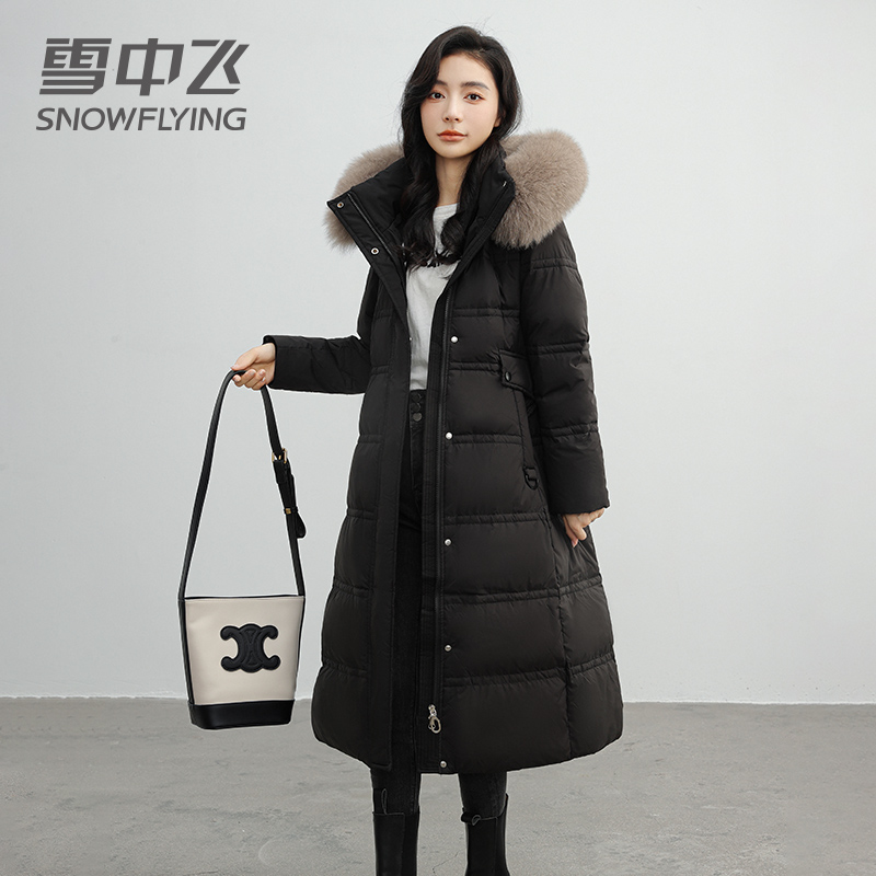雪中飞2025冬季新款女士中长款时尚狐狸大毛领收腰过膝保暖羽绒服