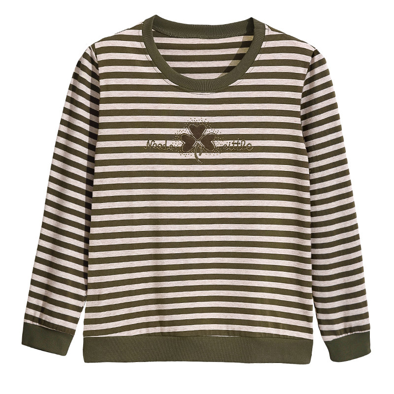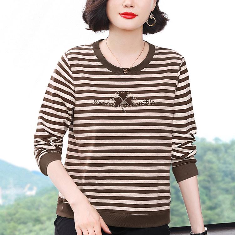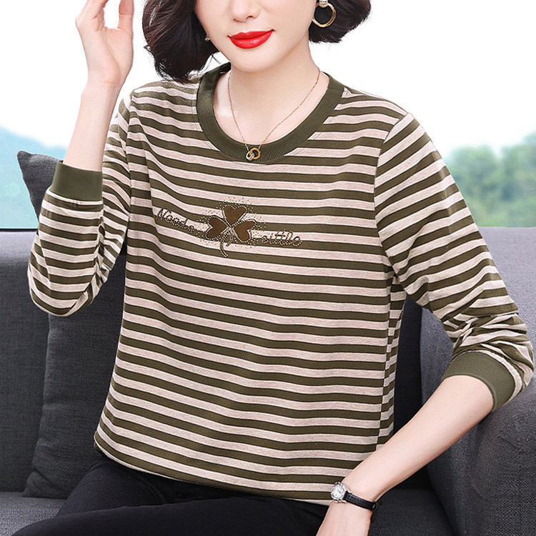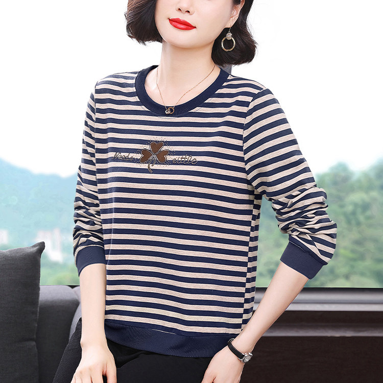 妈妈秋季新款纯棉条纹长袖T恤女装上衣中老年宽松烫钻洋气打底衫