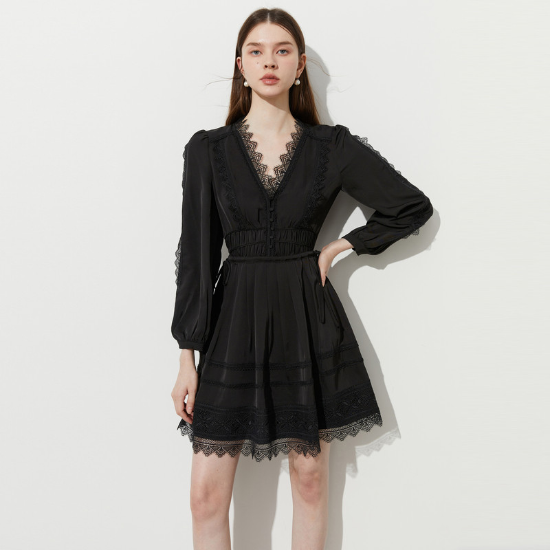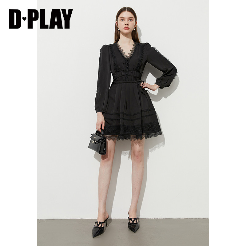 DPLAY【黑标】2025年秋季新款黑色连衣裙女短款蕾丝裙子长袖短