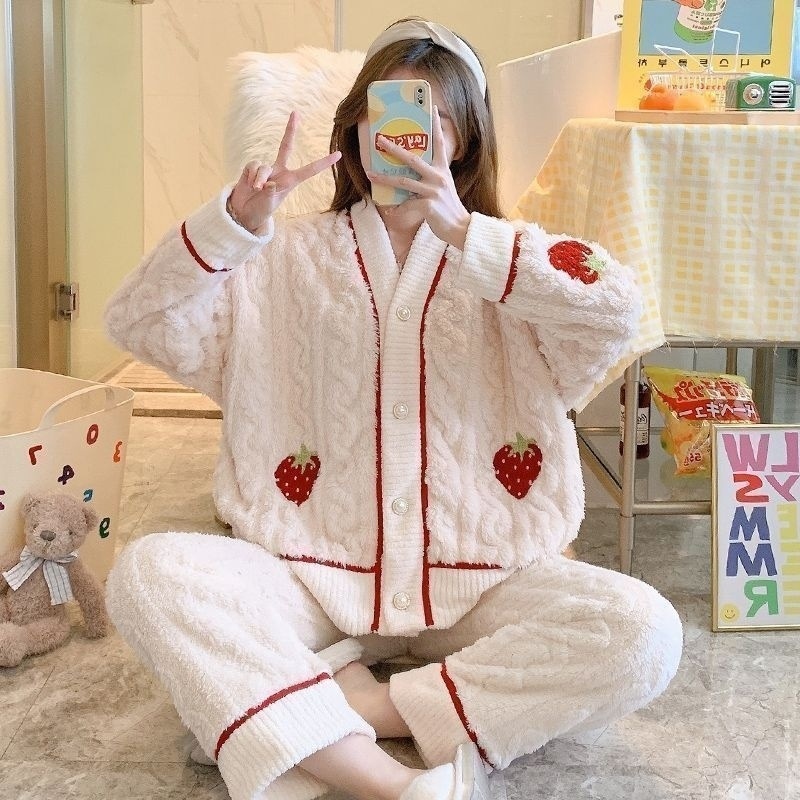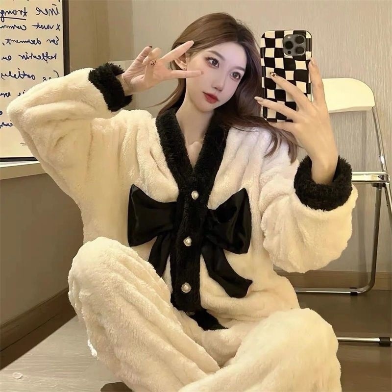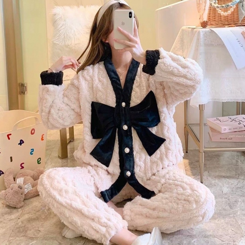 加绒加厚珊瑚绒睡衣女秋冬季网红ins小香风法兰绒外穿家居服套装
