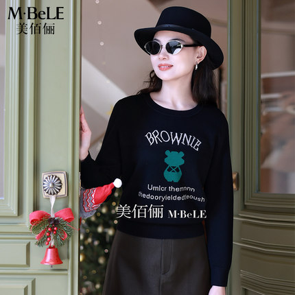 美佰俪2025秋冬新款羊毛衫套头圆领毛衣女小熊提花设计感针织打底