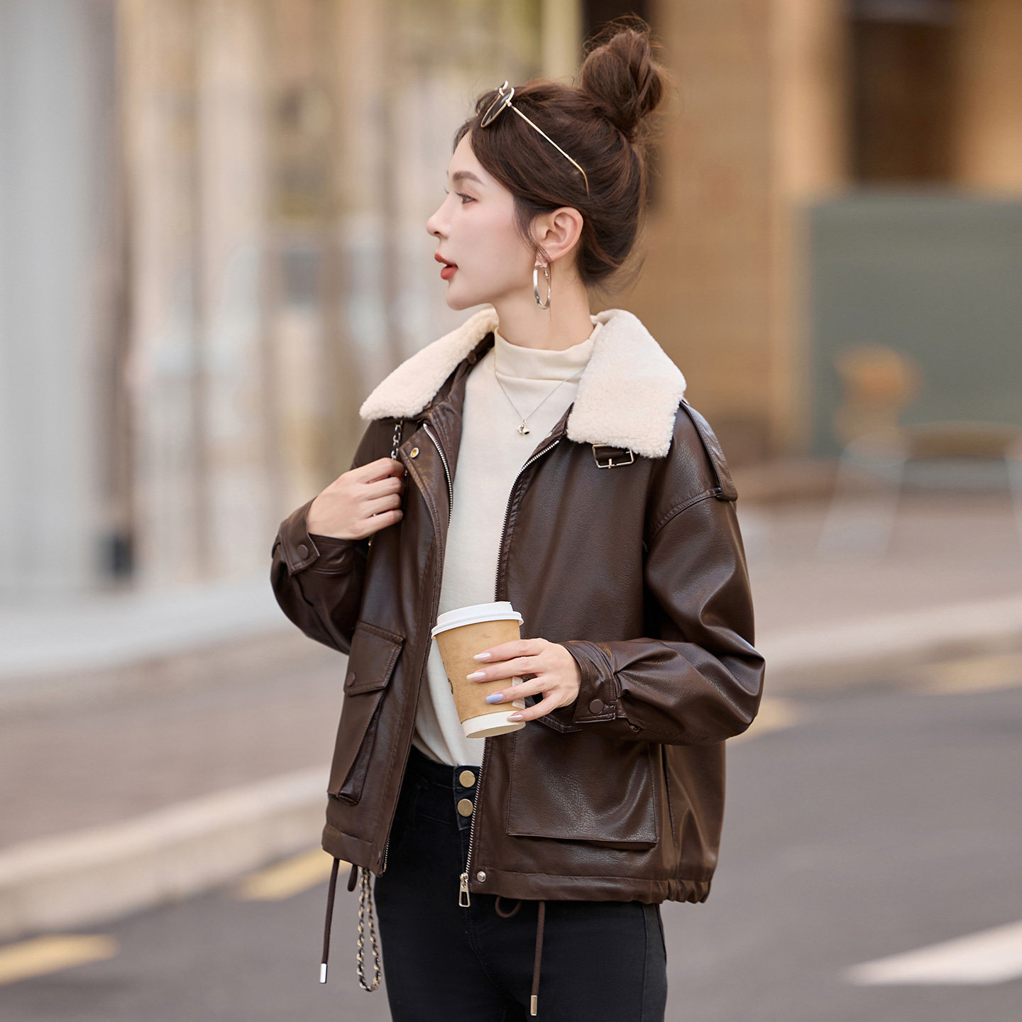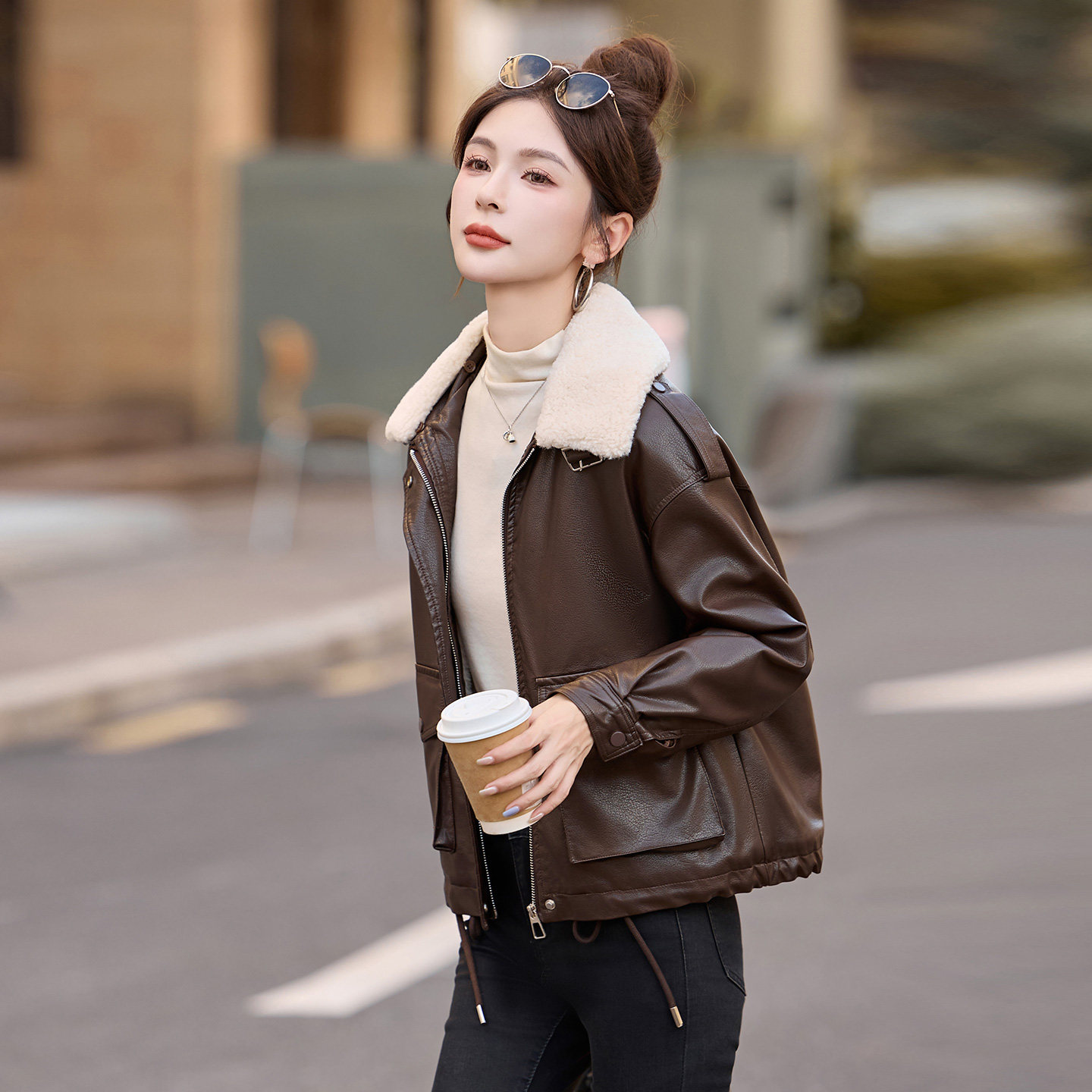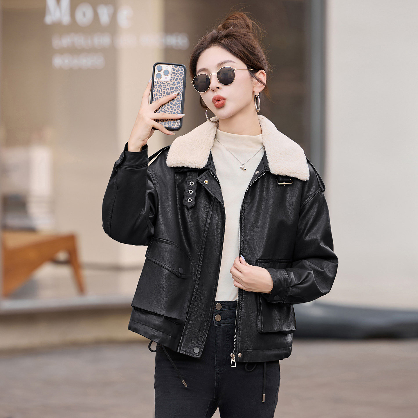 加绒加厚短款皮衣女2025冬季新款高级感显瘦机车大毛领皮夹克外套