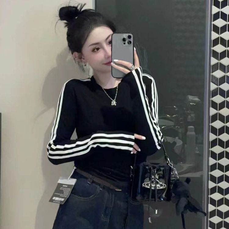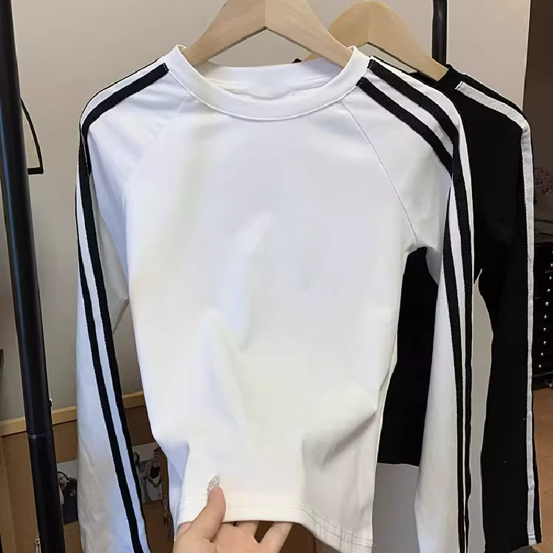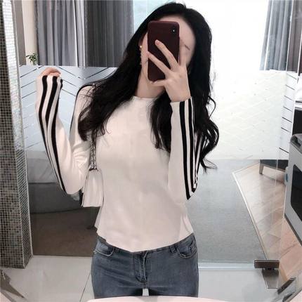 螺纹德绒200克 chic条纹长袖T恤女秋冬季修身插肩内搭打底衫上衣