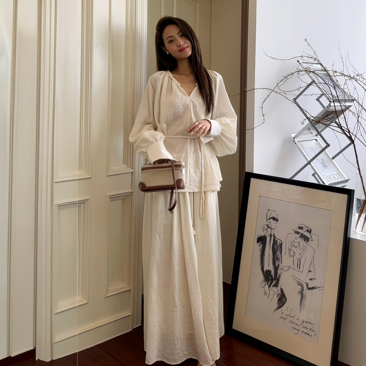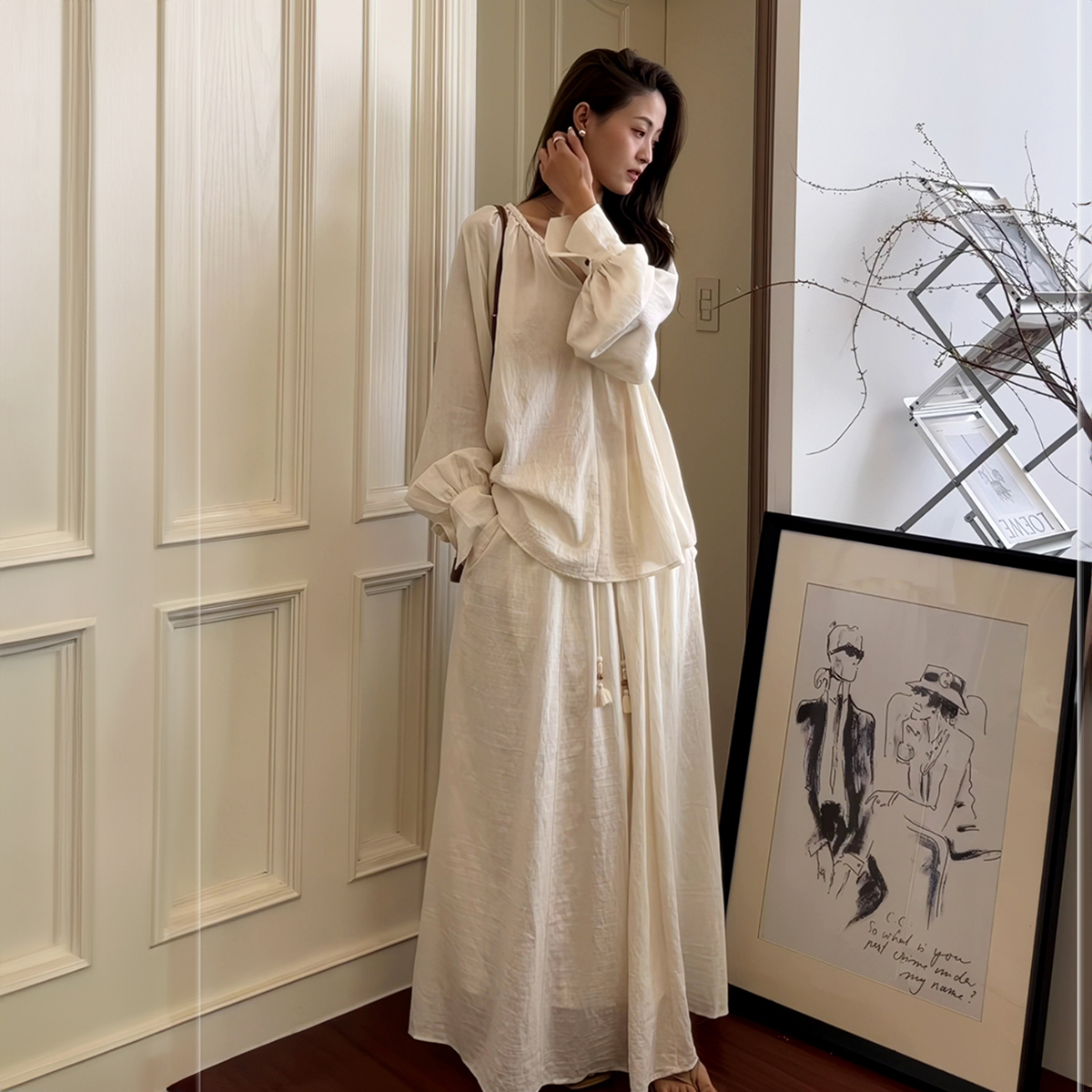 禅意风棉麻套装女 早春新款宽松系带衬衫 高级感复古半身裙两件套
