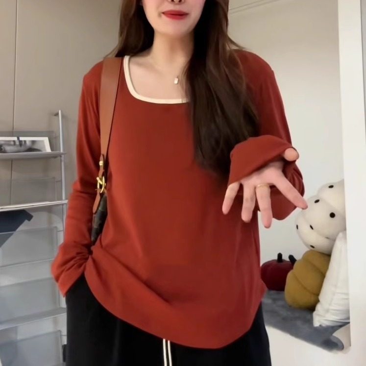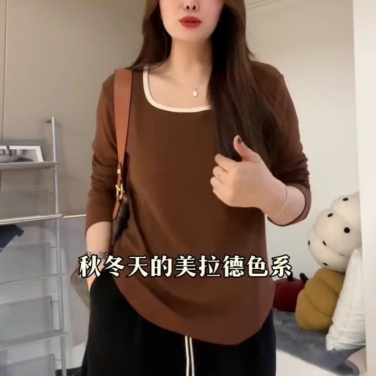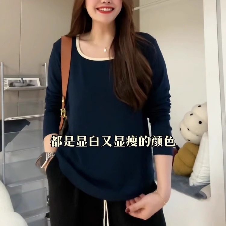 300斤大码女装方领T恤春秋女装打底衫微胖mm宽松遮肚显瘦长袖上衣