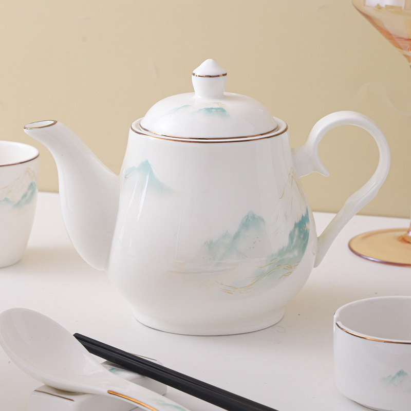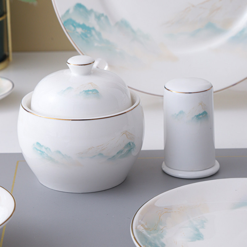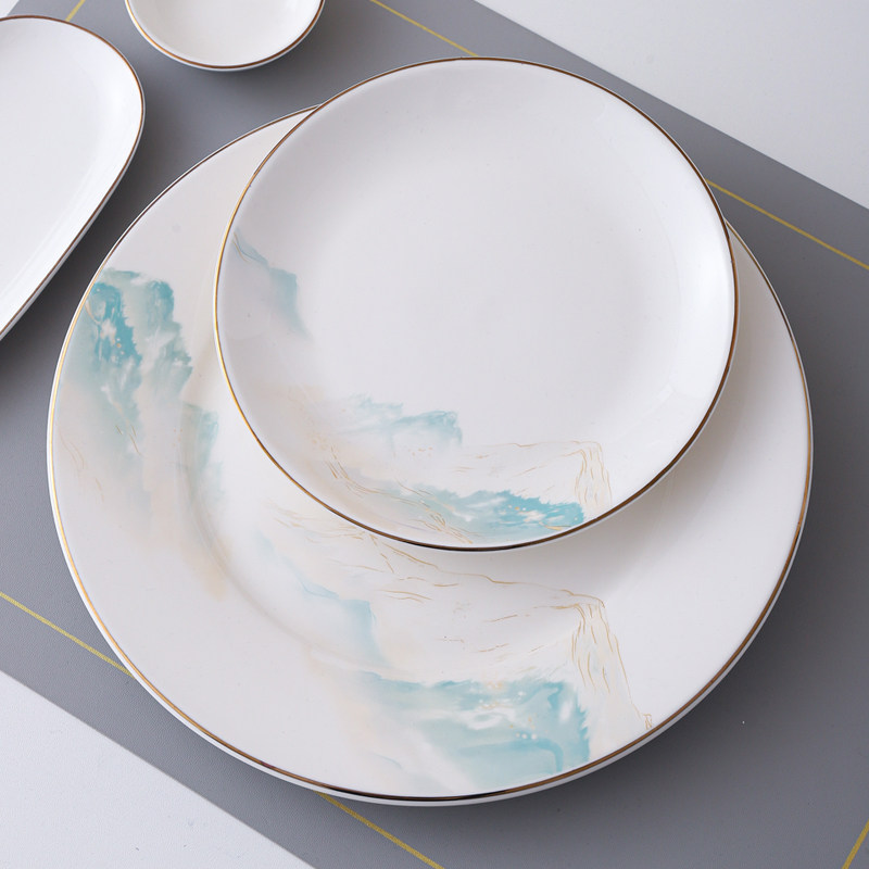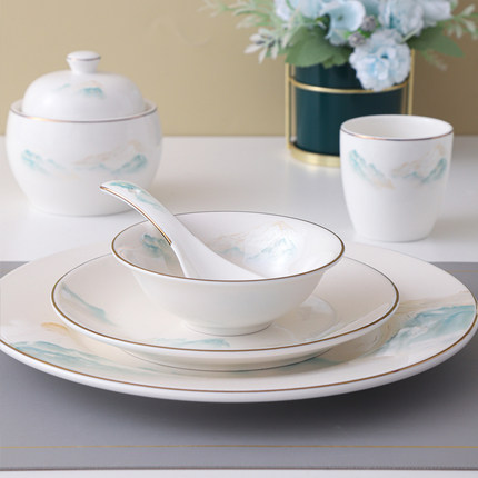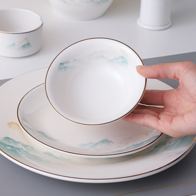 中式水墨风陶瓷餐具摆台商用轻奢碗碟盘金边青山如画瓷器套装家用