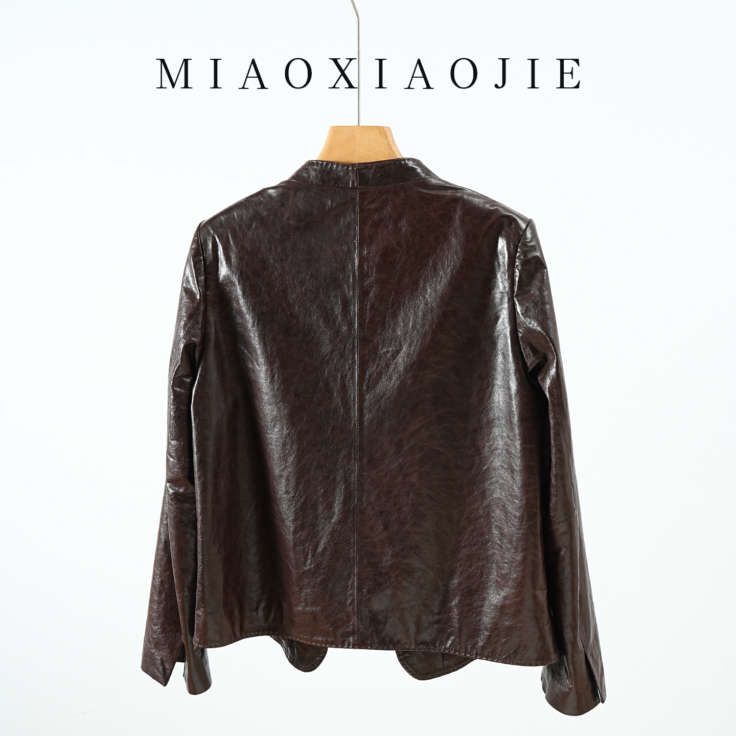 高级感油蜡真皮皮衣2025秋新款v领皮西装皮夹克绵羊皮短款外套女
