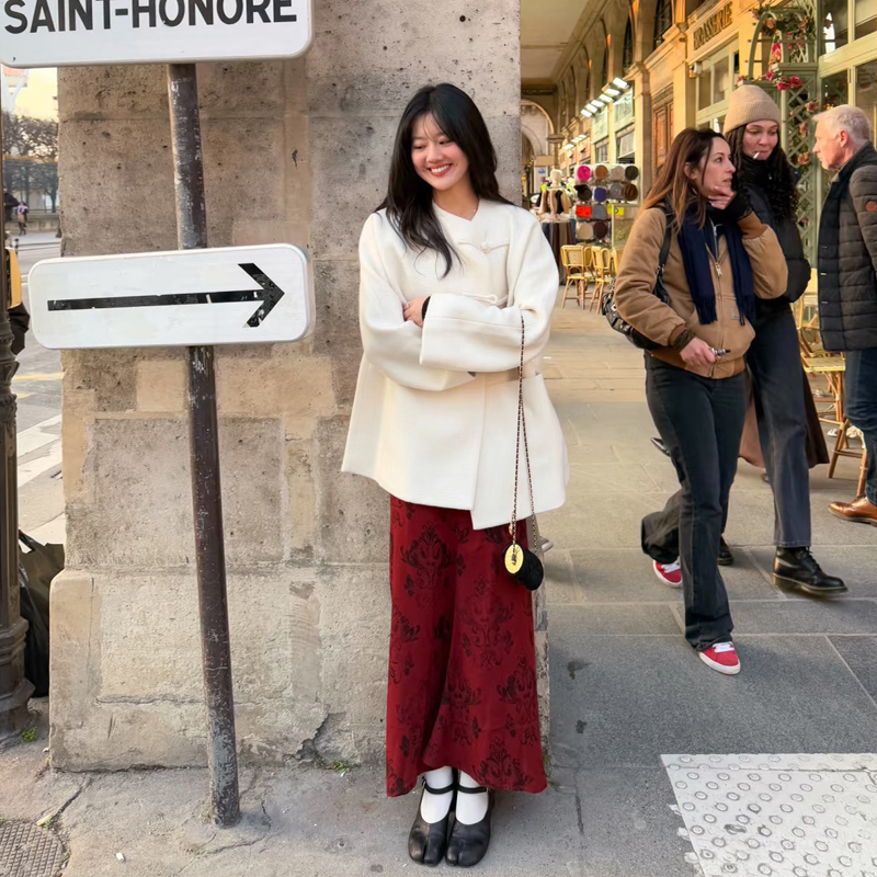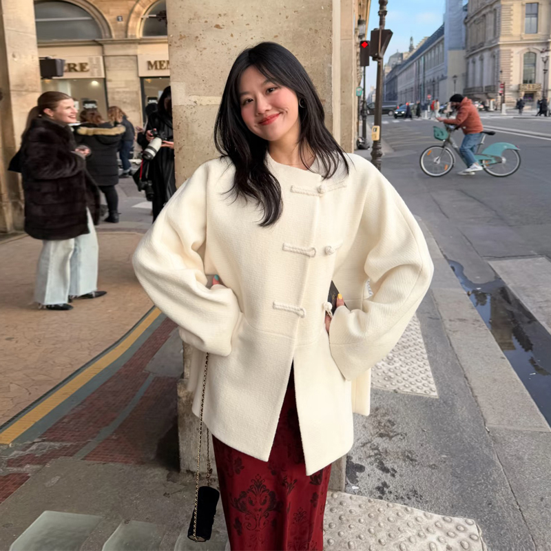 新中式国风盘扣白色毛呢外套女秋冬季新款温柔高级感气质毛呢大衣