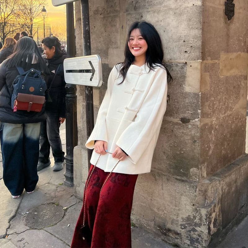 新中式国风盘扣白色毛呢外套