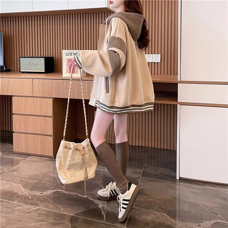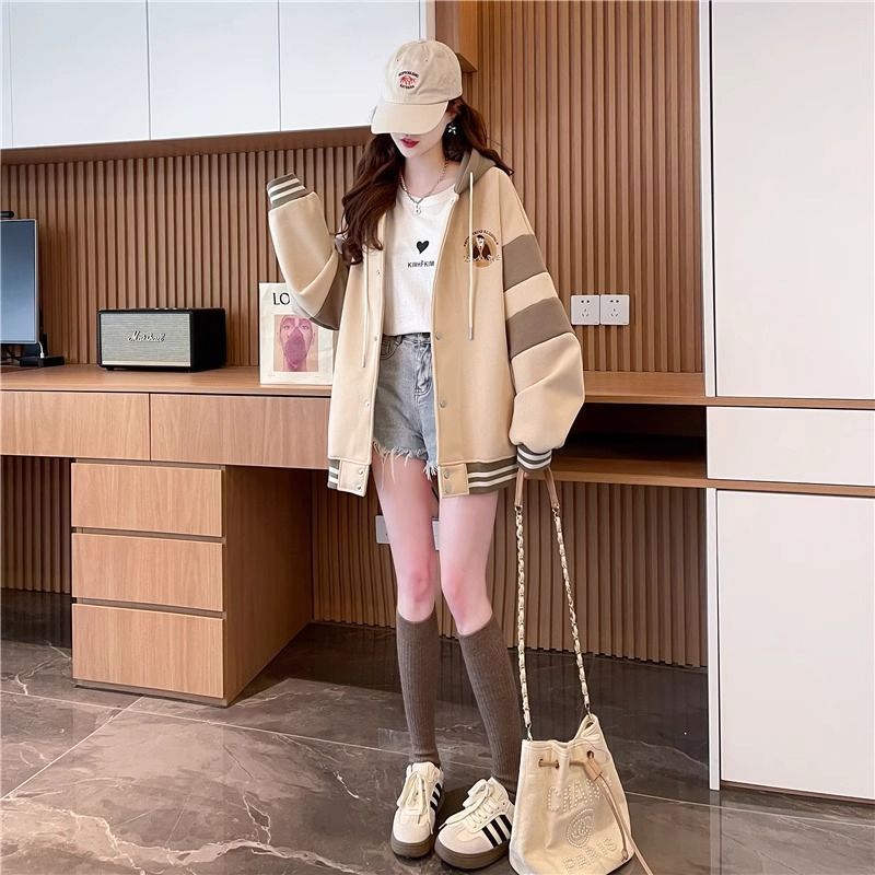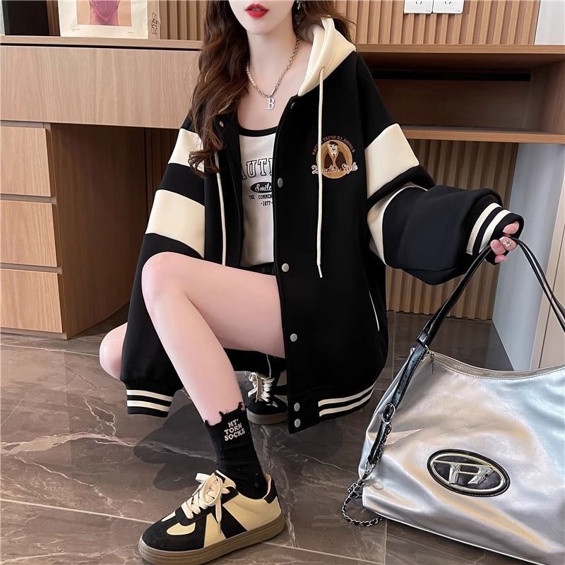 拼色刺绣连帽开衫卫衣女秋冬新款宽松大码棒球服潮牌美式显瘦外套