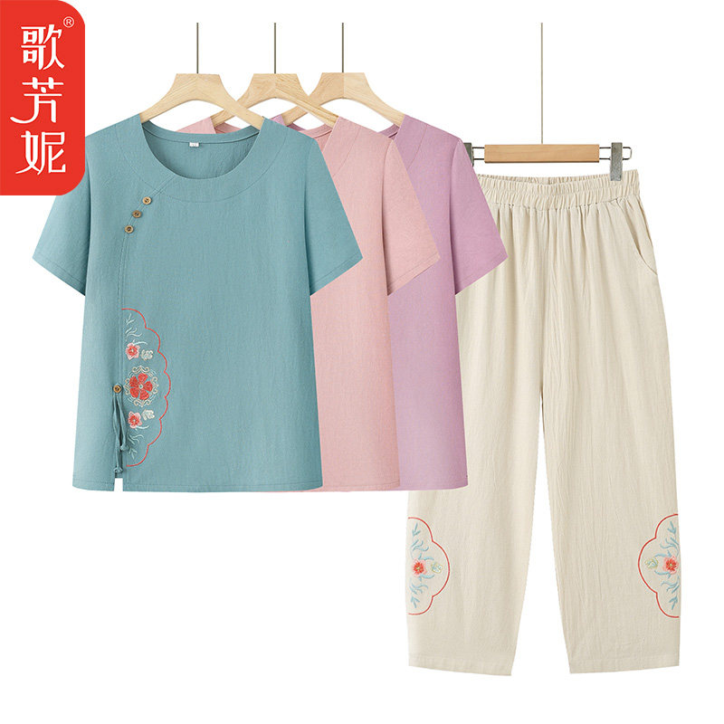 中老年人女装奶奶短袖女T恤宽松两件套装妈妈装夏季新款绣花上衣