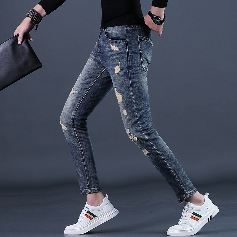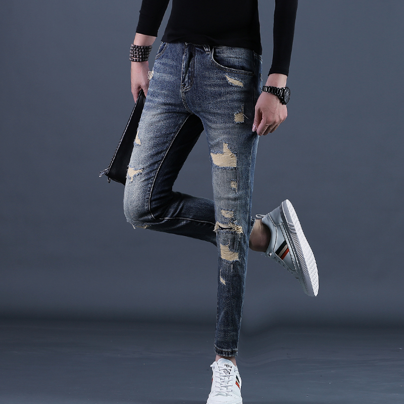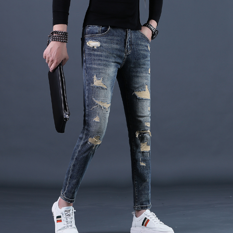 秋装九分裤男款破洞牛仔裤潮牌