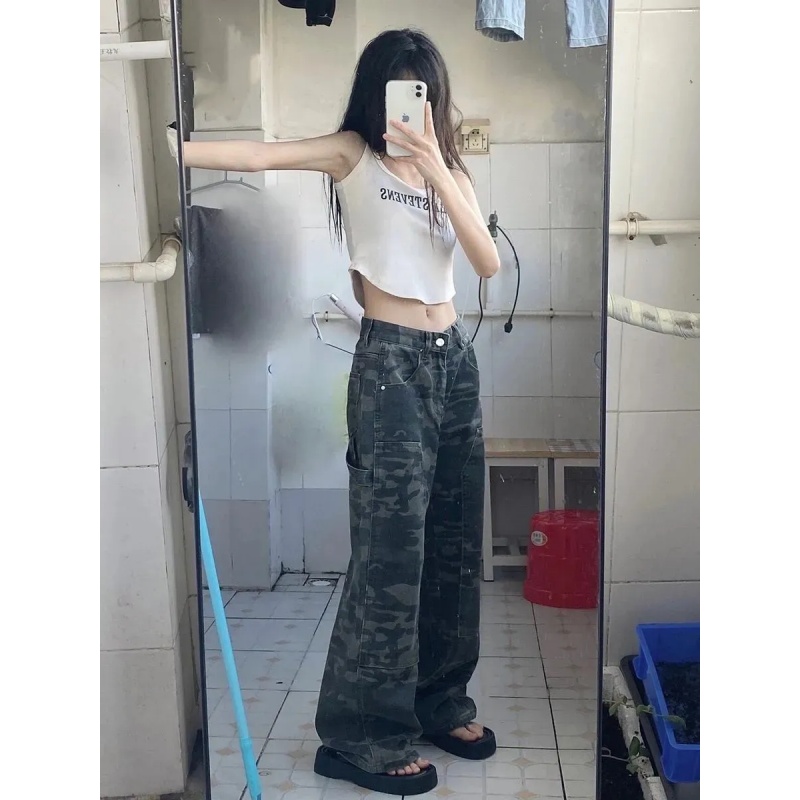 美式迷彩风工装牛仔裤女夏季宽松直筒阔腿长裤小众水洗拖地裤子潮