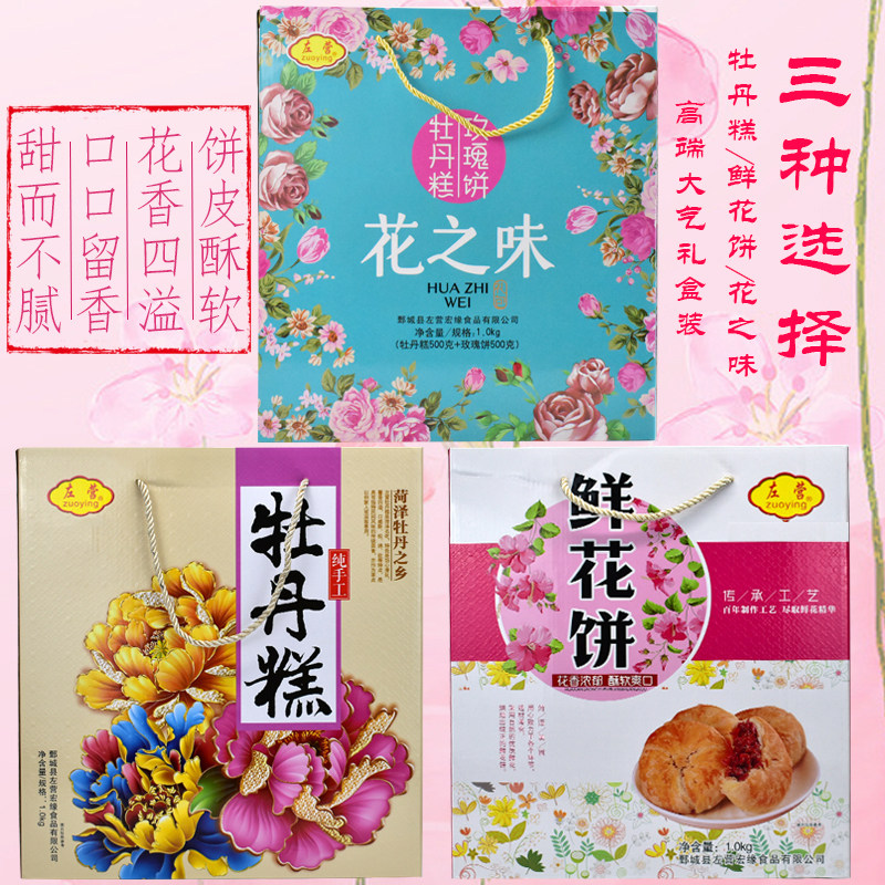 菏泽特产 花之味牡丹糕鲜花饼组合礼包酥皮糕点玫瑰饼1000g礼盒装
