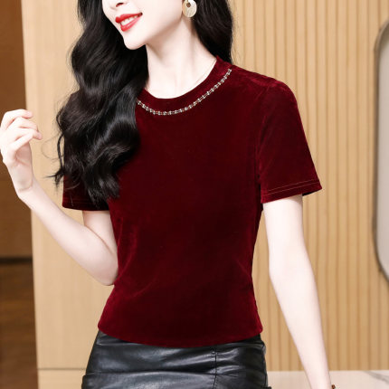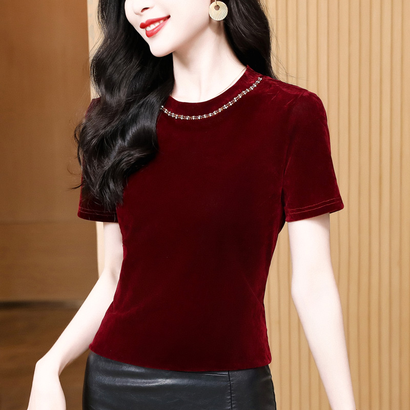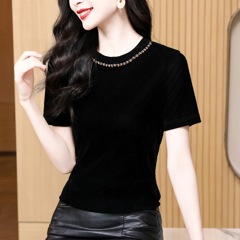 金丝绒短袖T恤女春装新款圆领钉珠打底衫妈妈款时髦洋气内搭上衣