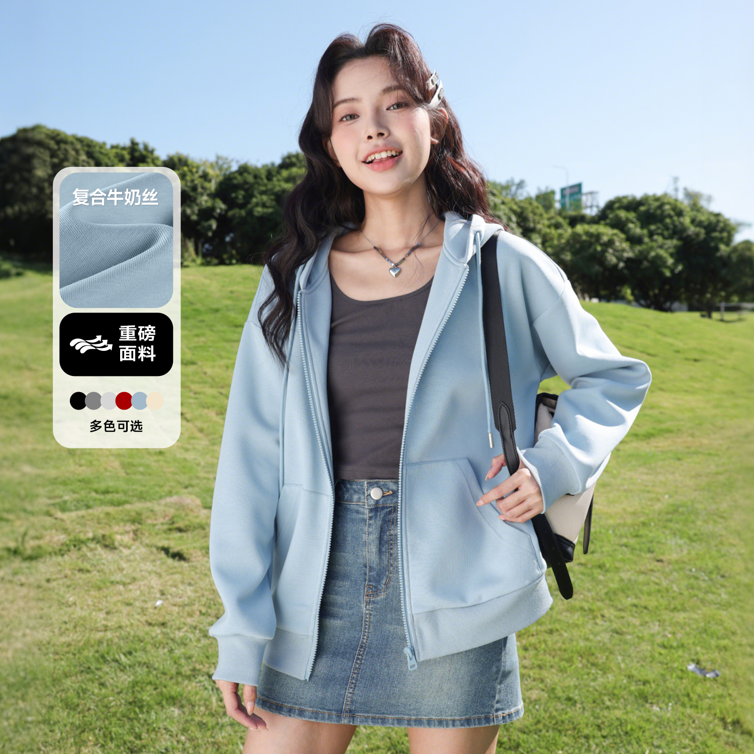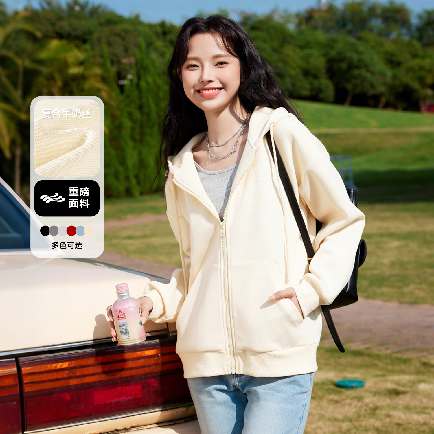 班尼路灰色百搭休闲外套女2025秋季新款拉链连帽开衫宽松卫衣女Q