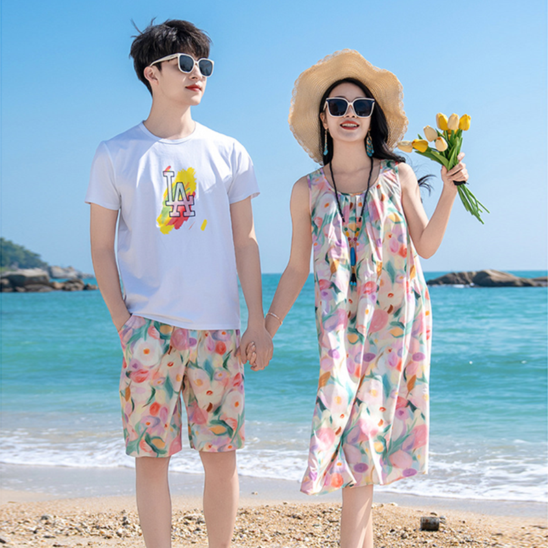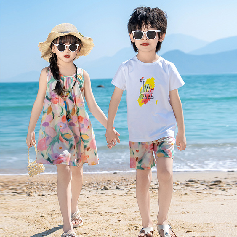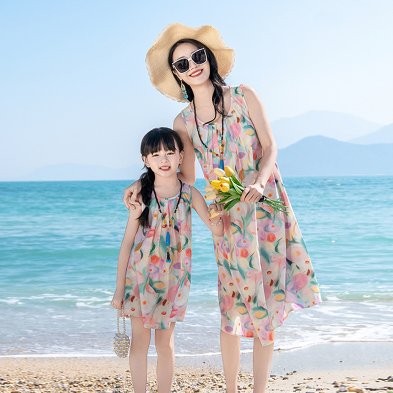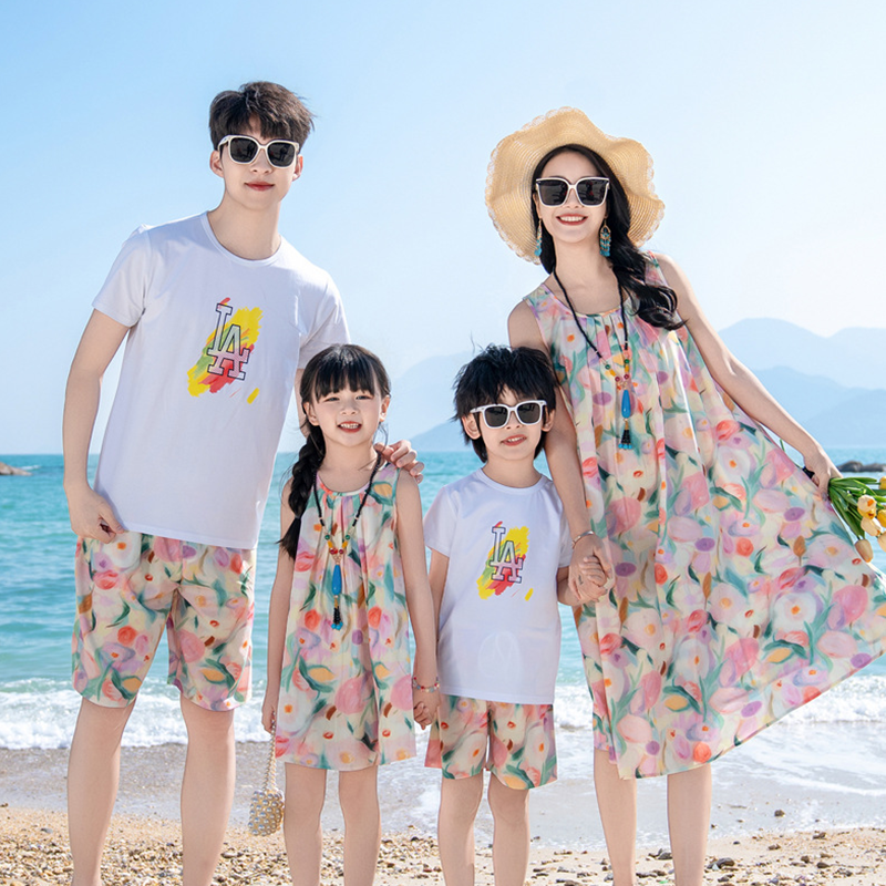 法式沙滩亲子装一家三口夏季短袖套装2025新款母女海边度假连衣裙