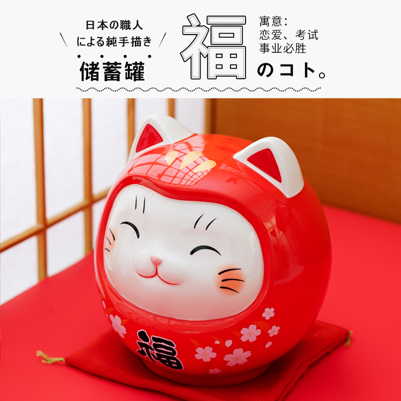 【自营】日本药师窑达摩招财猫陶瓷摆件家居存钱罐樱花储蓄罐大号